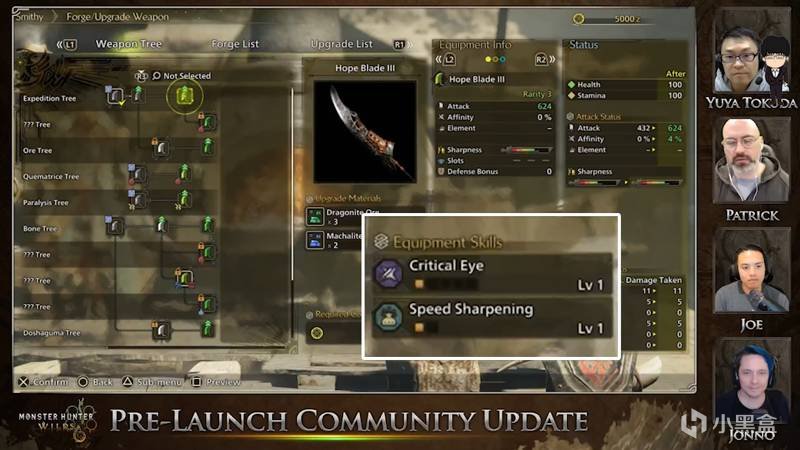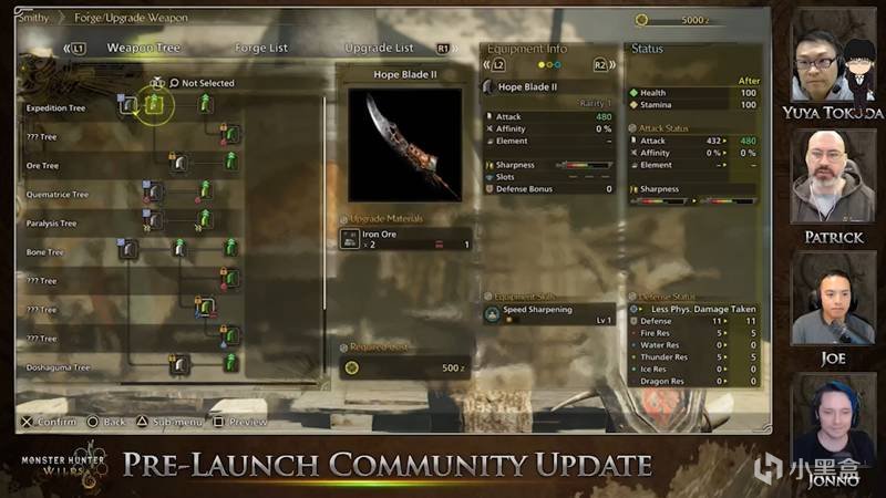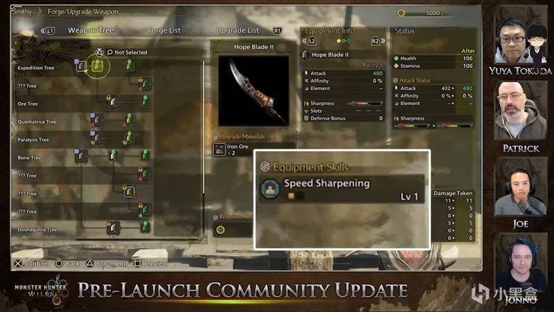未來14把武器會改善打點和傷害過低的問題。整體調整方向是增強弱勢武器。過於強項的武器並未說明是否會進行下調。武器升級方面演示了升級後的繼承和新增內容。演示爲希望大劍2,升級爲3級後除了保留砥石強化外,還增加了看破效果