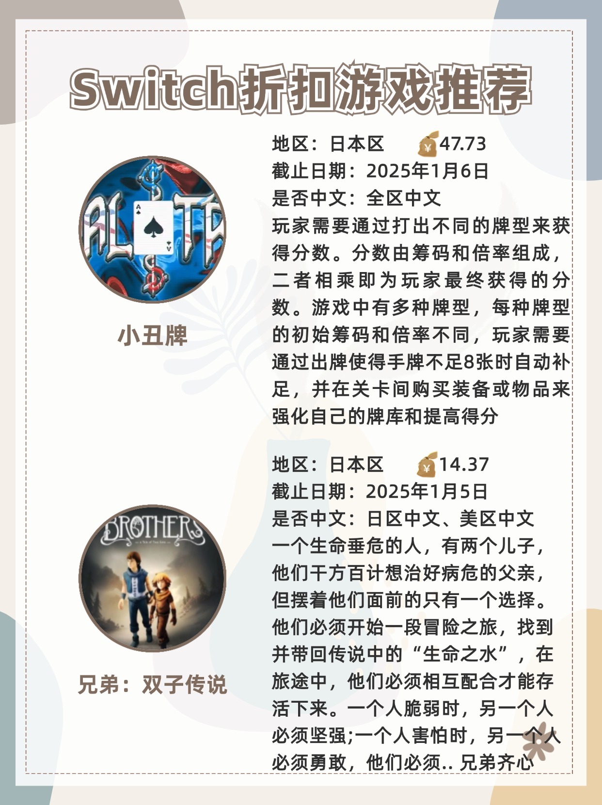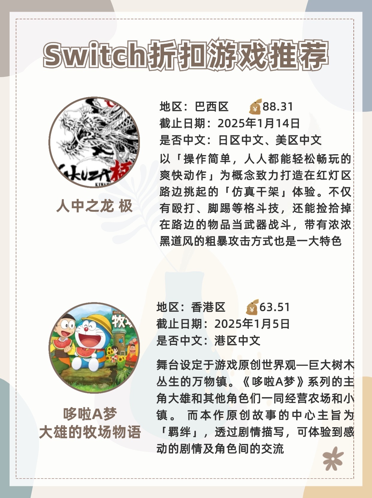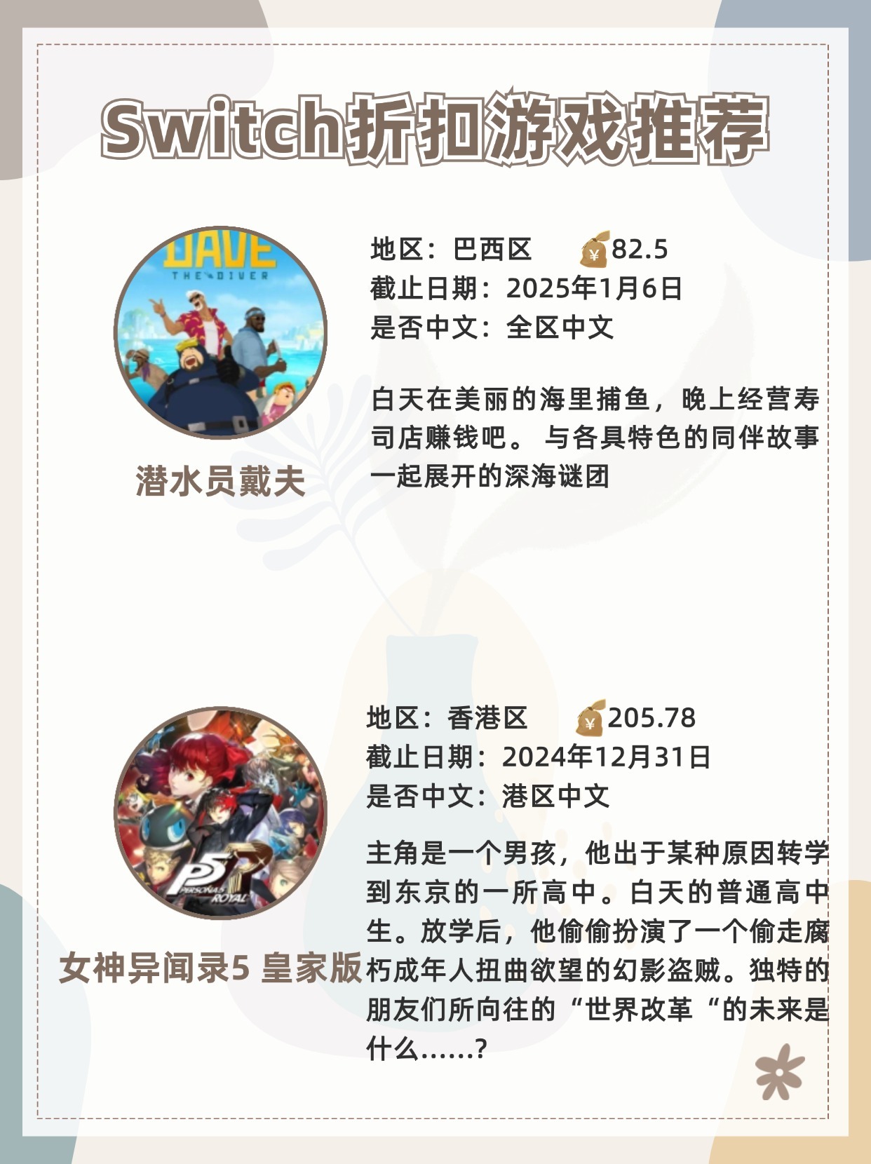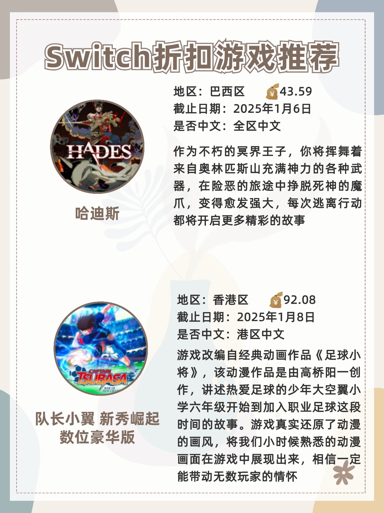 本週遊戲折扣比較多,NS運動在巴西服折扣,許多玩家蹲的雙人成行、潛水員戴夫、哈迪斯也進入了折扣區!不過像哈迪斯和褪黑素這種遊戲,直接在阿根廷服金幣兌換比較合適! 除了這些熱門外,史低的文明6,畫風超棒的涅瓦也非常值得一試! 本週的遊戲清單出來了,有需要的玩家記得收藏!!