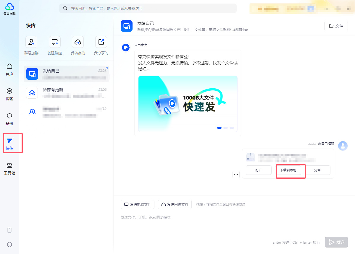 步驟2,進入左側快傳界面,,找到剛剛發送給自己的文件,點擊下載到本地。