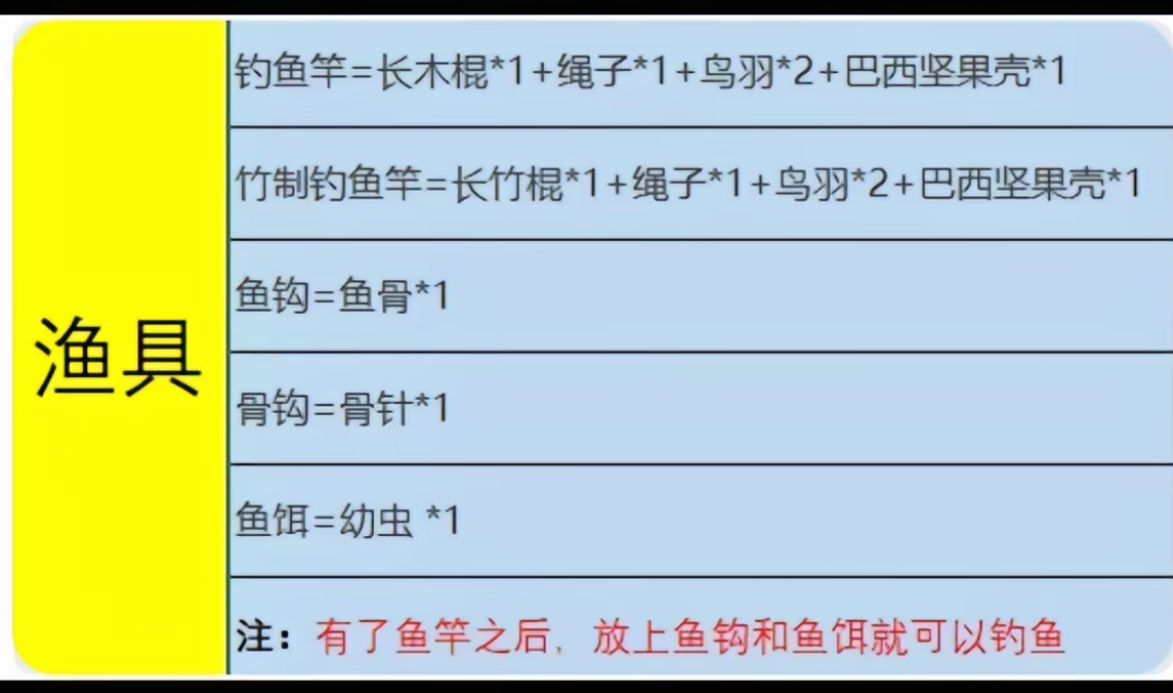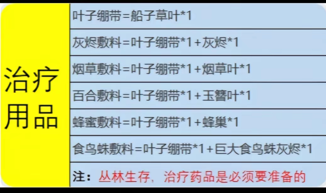 以下是《綠色地獄》遊戲中合成物品的配方表,希望對您有所幫助