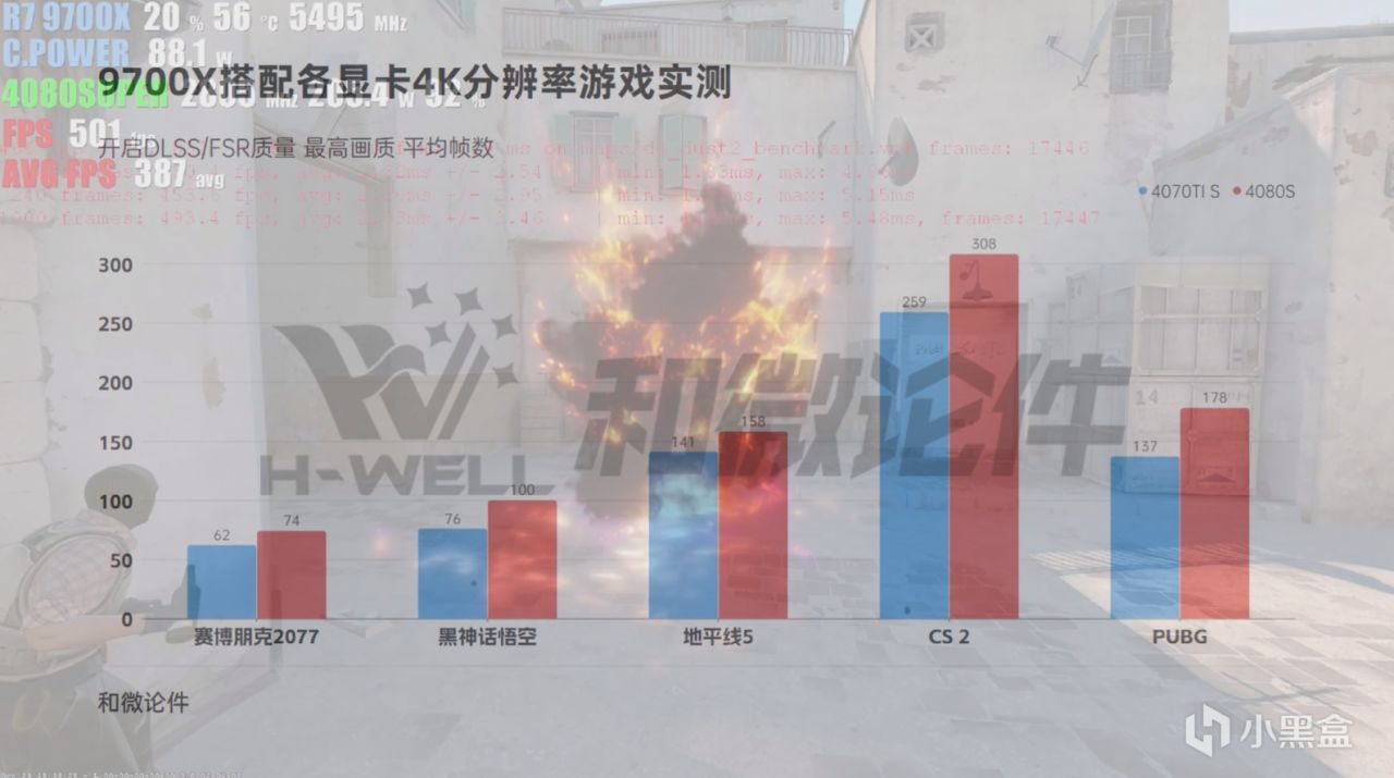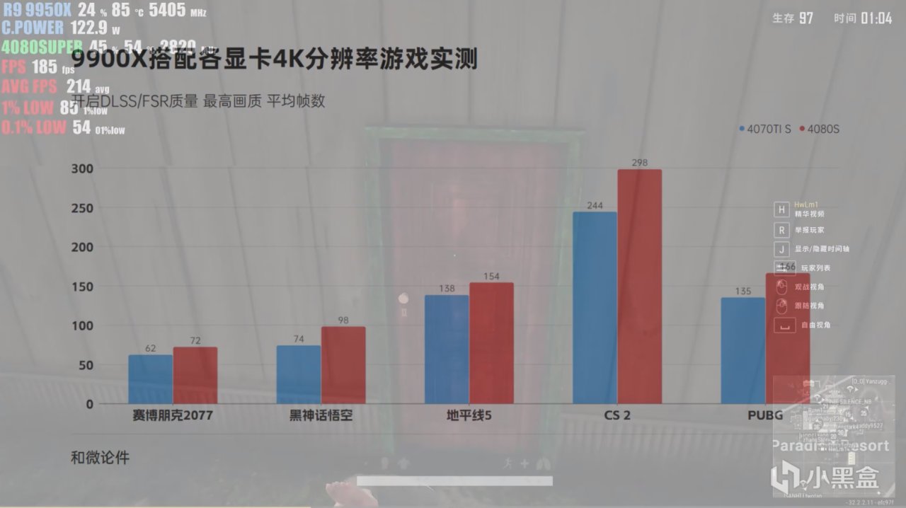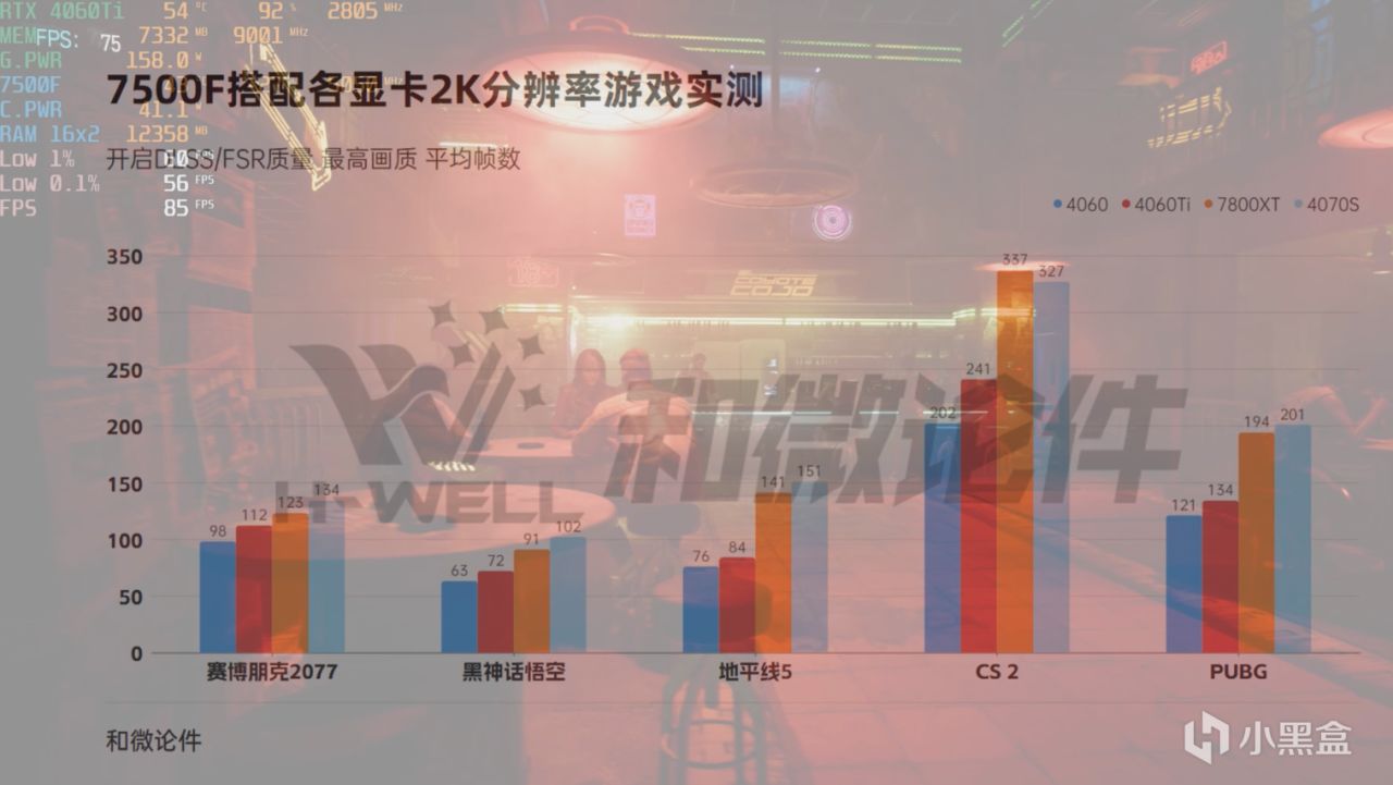 我們爲4060Ti以及4070SUPER是進行了2K分辨率的測試,測試結果都要比之前用7500F搭配幀數高一點,4060Ti 2K其實已經完全沒有瓶頸了,4070SUPER更多是起到一個錦上添花的作用。讓我們的遊戲體驗更棒。