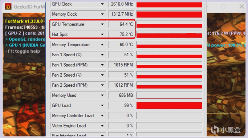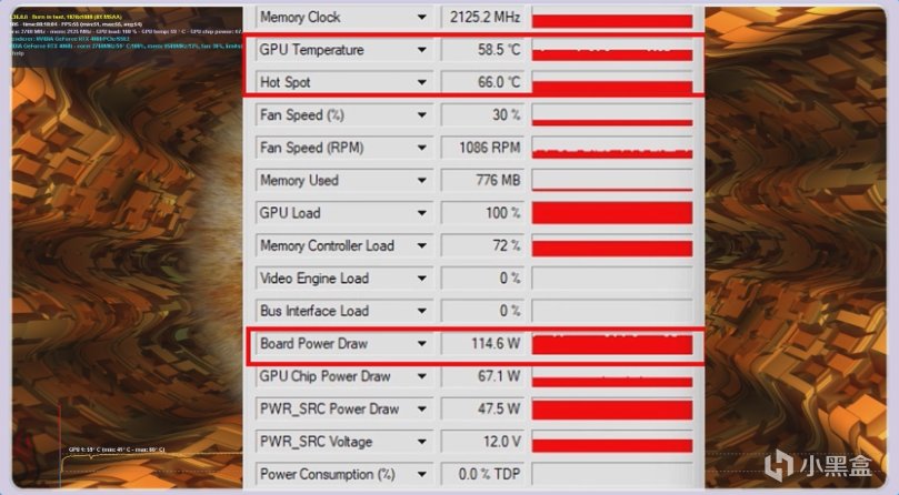 經過甜甜圈10分鐘的滿載壓力測試,最終功耗是來到了114.6W,此時GPU的溫度爲58.5度,熱點溫度最終爲66度。4060魔龍作爲微星的旗艦型號,這個溫度表現在所有4060顯卡中都是很出色的。