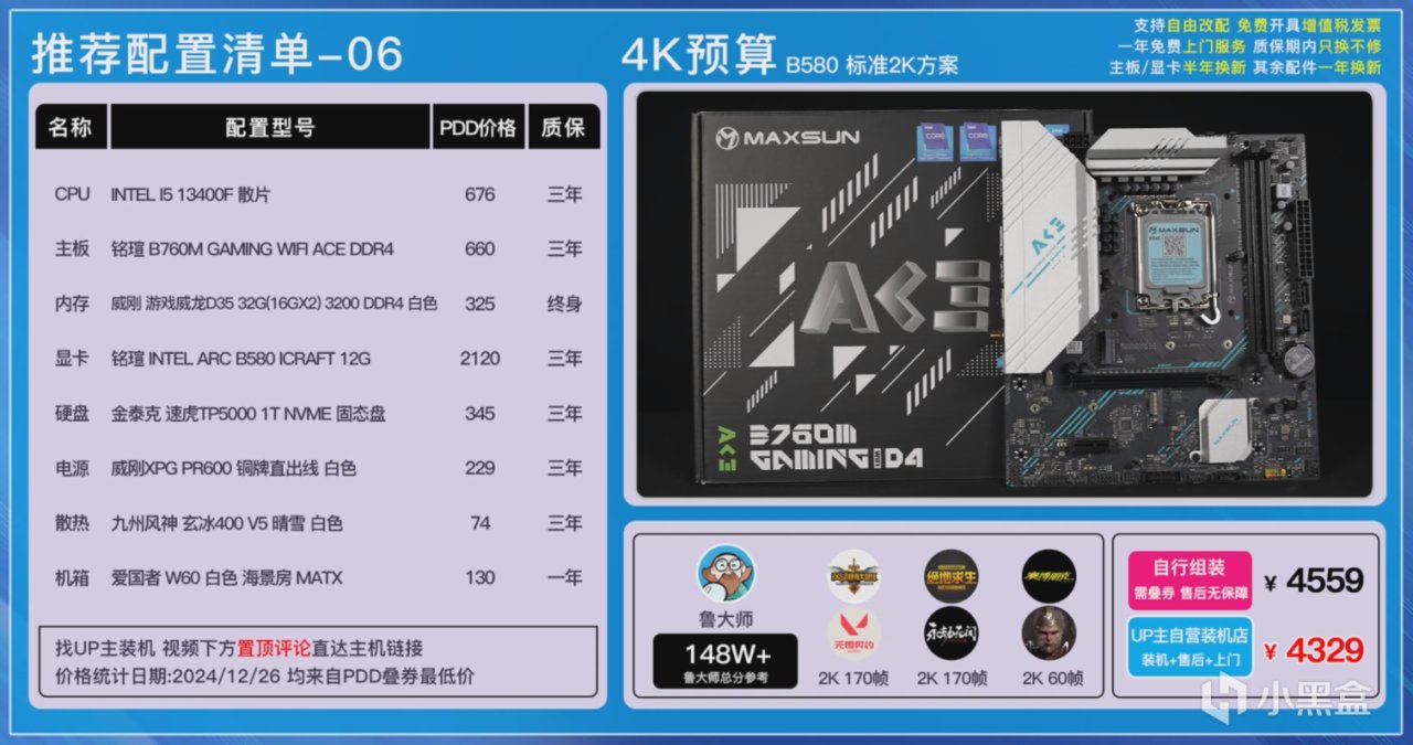 B580的方案,主板我們搭配了銘瑄的B760M GAMING ACE WIFI主板,內存威剛D35 3200頻率雙16G組成32G雙通道,保證生產力不會產生瓶頸。還有金泰克TP5000 1TB TLC顆粒硬盤以及威剛PR600 銅牌單路12V輸出電源,再搭配上九州風神的玄冰400 V5四熱管風冷散熱以及愛國者W60純白海景房機箱。