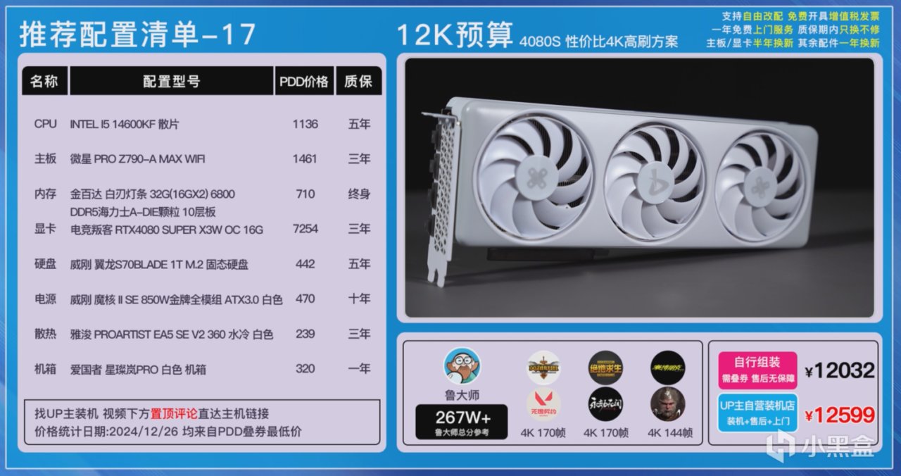 我們這裏就給大家搭配出了3套方案,顯卡分別選擇了映衆4070TI SUPER 曜夜Ultra,電競叛客4080SUPER X3W MAX,索泰的4080SUPER 月白。