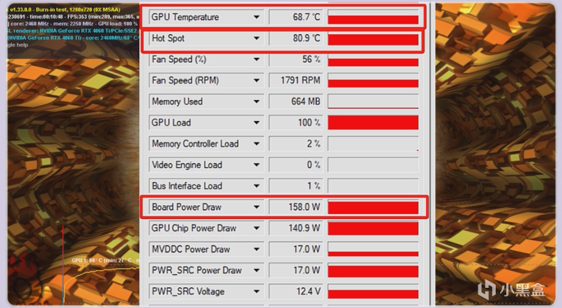 在甜甜圈烤機10分鐘後,在功耗爲158W時,GPU核心溫度最終是來到了68.7度,熱點溫度來到了80.9度,盈通的這張顯卡的用料還不錯,給到了3根6mm的熱管,而且在價格上給到我們一些驚喜。