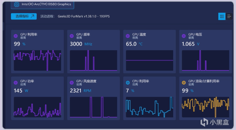 在甜甜圈10分鐘滿載壓力測試下,它的功耗最高來到145W,此時溫度爲65度,畢竟是三風扇的顯卡,溫度表現的確要比雙風扇的里程碑更好一些。
