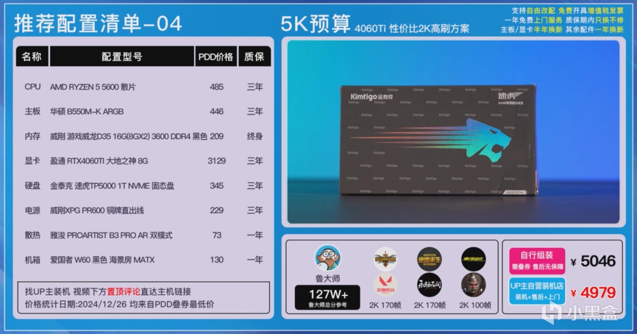 4060Ti的方案我們是在黑色方案的基礎上升級了顯卡、硬盤和機箱,硬盤是升級到了金泰克的TP5000 1TB PCIe4.0的TLC顆粒固態,機箱也是升級成愛國者的W60黑色無立柱海景房,整體造型與星璨嵐非常相似,顏值和做工用料都挺不錯,喜歡玩燈也有非常好的視覺效果。