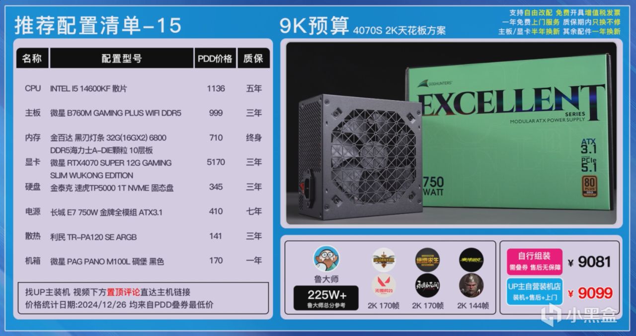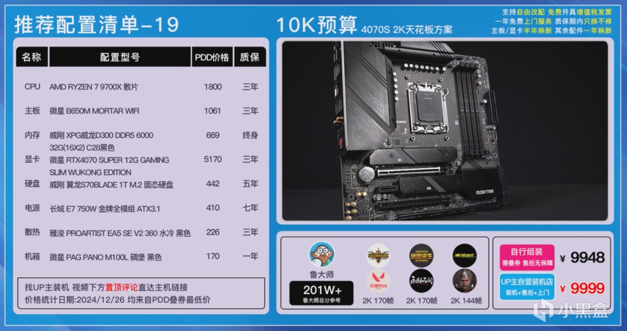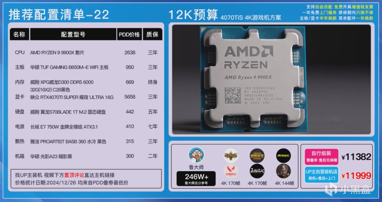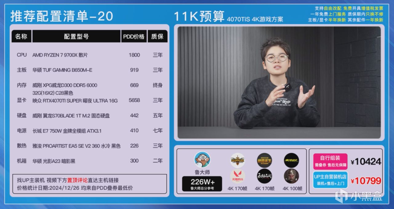 第一套方案是9900X搭配4070TI SUPER的黑色方案,可以同時滿足大家生產力以及遊戲的需求。因爲9900X的功耗還是比較高的,散熱這裏我們選擇了雅浚的BA5進行壓制。