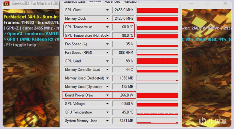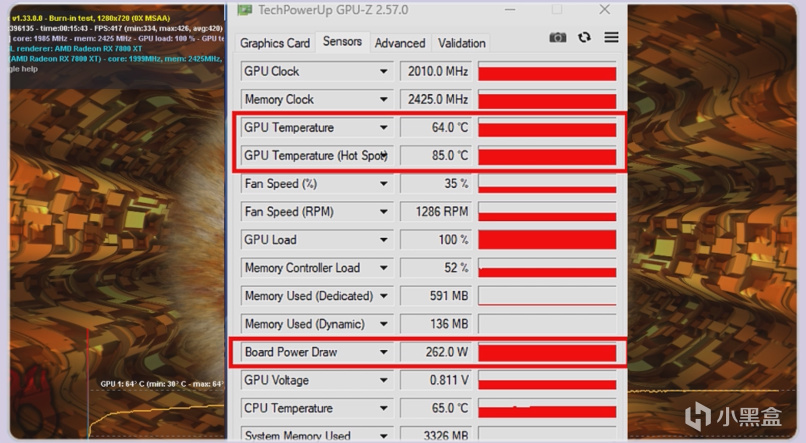 在Fur Mark烤機10分鐘後,GPU核心溫度爲64度,熱點溫度爲85度,功耗爲262W。A卡買華碩一方面是保證顯卡的做工用料,另一方面肯定就是爲了3年個人送保來的,猶豫不決選華碩準沒錯。
