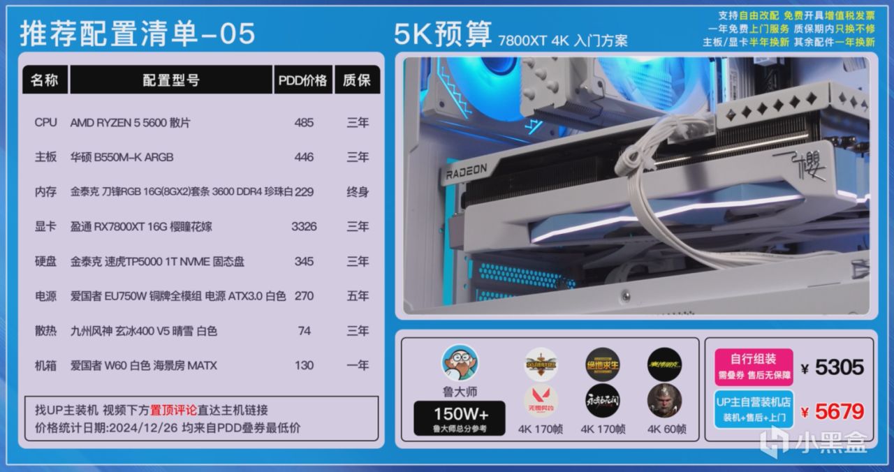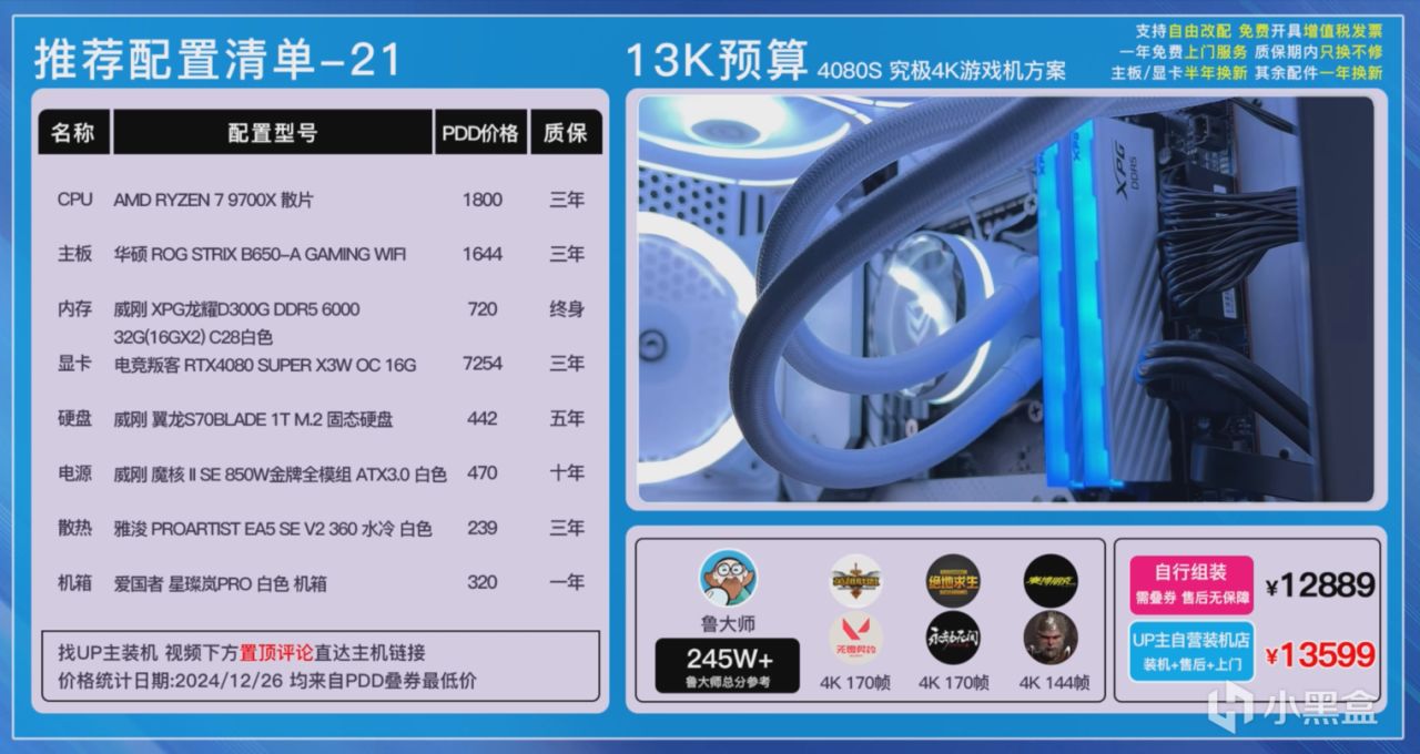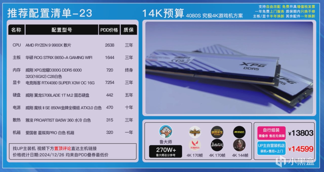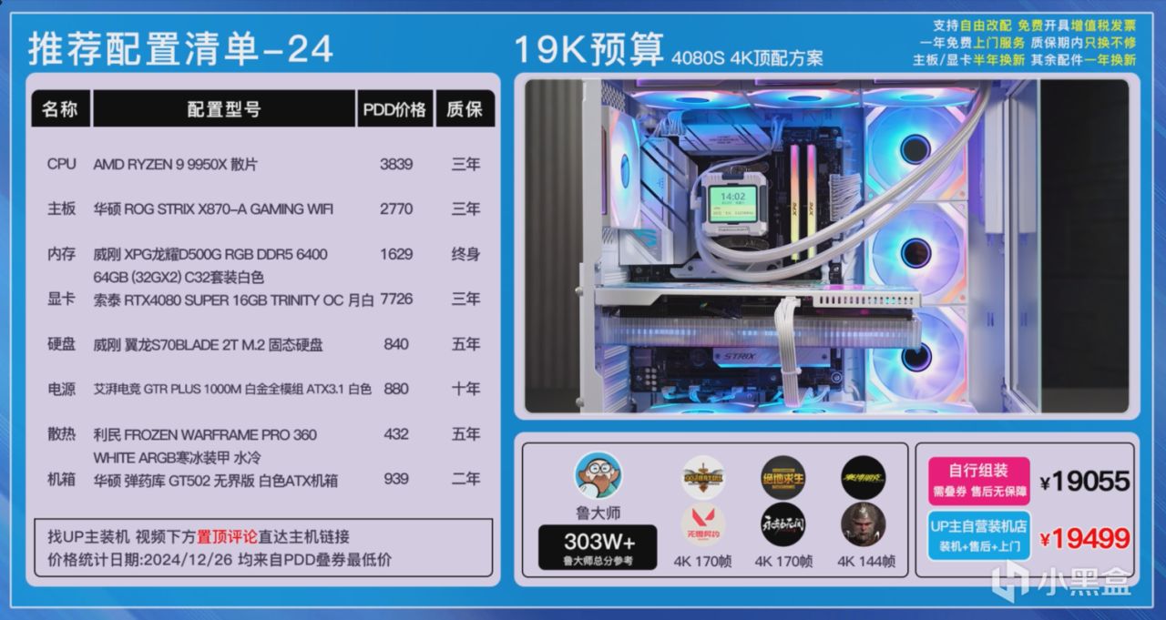第二套方案則是9900X+4080SUPER的純白方案,每個硬件自然也是更換成了白色,ROG B650-A吹雪主板、D300G 6000C28低時序燈條、威剛S70B 1T PCIe4.0TLC顆粒硬盤以及星璨嵐PRO三面玻璃海景房,整機的顏值和性能都是無死角拉滿的,這套配置可以完美直上5080,實在不放心,你升級下1000W電源就完事了。