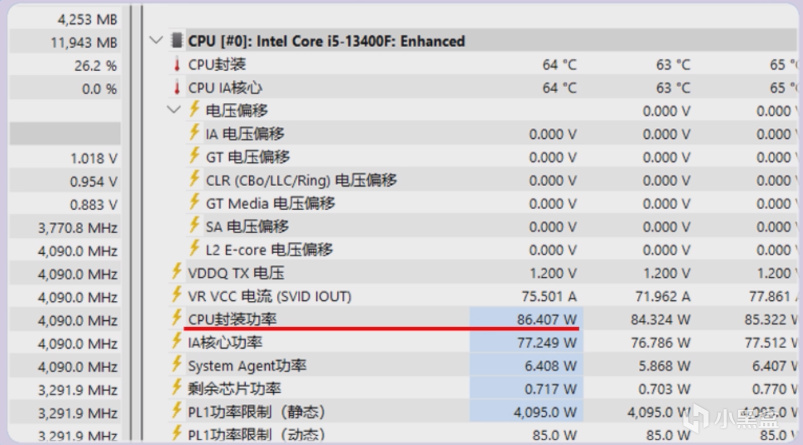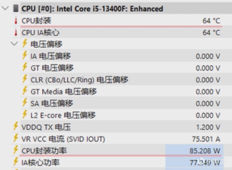 此時九州風神的玄冰400V5 晴雪可以將功耗爲85W的13400F溫度壓制在64度,不僅主板可以跑滿13400F,散熱也沒有任何的壓力。