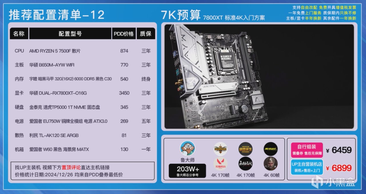 7800XT的方案因爲顯卡是華碩,所以我們主板是選擇了華碩B650M AYW WIFI,因爲這張顯卡滿載狀態下功耗可以來到262W,電源我們還是換回了性價比、性能兼顧的愛國者的EU 750W銅牌全模組ATX3.0版。