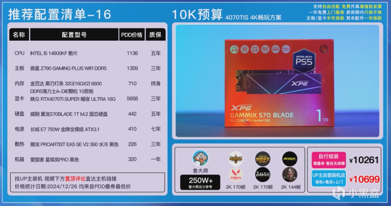 在搭配4070TI SUPER在不丐的基礎上,整機的價格肯定是要突破萬元了,但是我們每個硬件都可以選擇非常好的,比如說微星Z790 GAMING PLUS WIFI主板以及威剛S70B 1TB TLC顆粒的PCIe4.0滿速帶緩存硬盤。還有顯卡也可以選擇與超級冰龍同款相同用料的映衆4070TI SUPER 曜夜Ultra,散熱方面都搭配Z790主板了,很多小夥伴想要玩一下超頻,雅浚的EA5 SE 360水冷也可以做到穩壓。