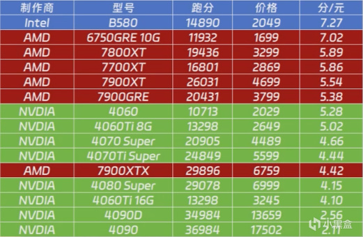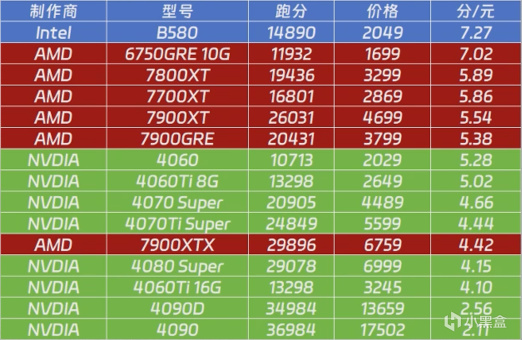 用13400F來搭配B580、4060和4060Ti也是非常主流的配置了,這三張顯卡的性價比天梯圖大家可以看一下,在N卡中是可以排到第一與第二的。