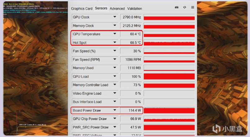 在甜甜圈烤機10分鐘後,功耗爲114.4W時,GPU的核心溫度爲60.4度,熱點溫度爲68.5度,4060這個級別的顯卡因爲功耗低的原因,各家的做工用料在溫度上的表現其實都大差不差,我們選擇的時候認準支持三年個人送保的AIC品牌就好了。
