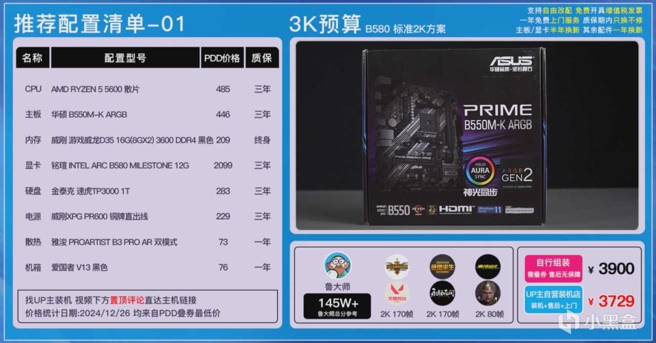 具體的配置方面,B580的這套方案,主板我們搭配了一張華碩的B550M-K ARGB,內存使用了3600頻率的威剛D35 8Gx2組成16G的雙通道,還有金泰克的TP3000 1T TLC顆粒的固態硬盤以及僑威代工,單路12V輸出的威剛PR 600銅牌電源,散熱使用的是雅浚的B3 PRO 4熱管的風冷來壓制5600,機箱則是百元價位中顏值和質感都還不錯的愛國者V13。