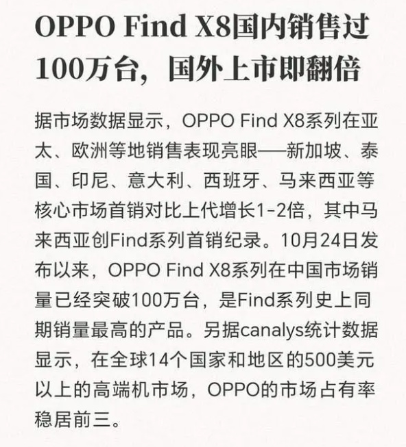 產品也隨之大賣,Find X8 前兩個禮拜的國內銷量都已經超過了百萬臺了。