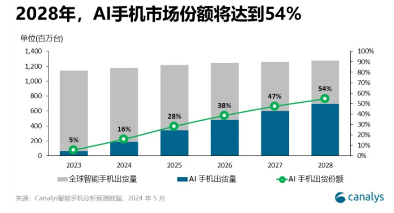 根據 IDC 的數據顯示,中國智能手機銷量已經連續 4 個季度同比增長,而根據 Canalys 預測,4 年後, AI 手機佔比將從今年的 16% 大漲到 54%。