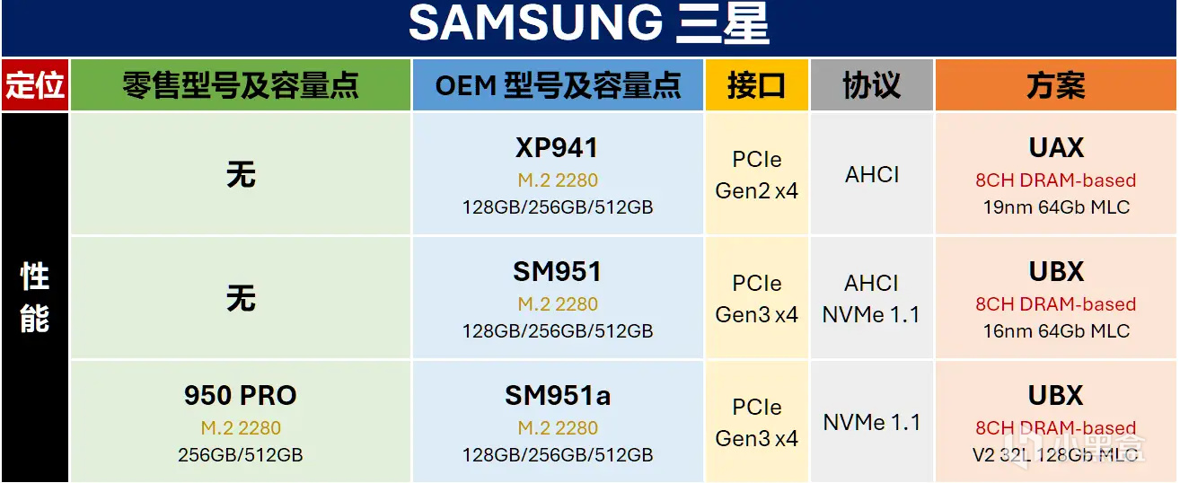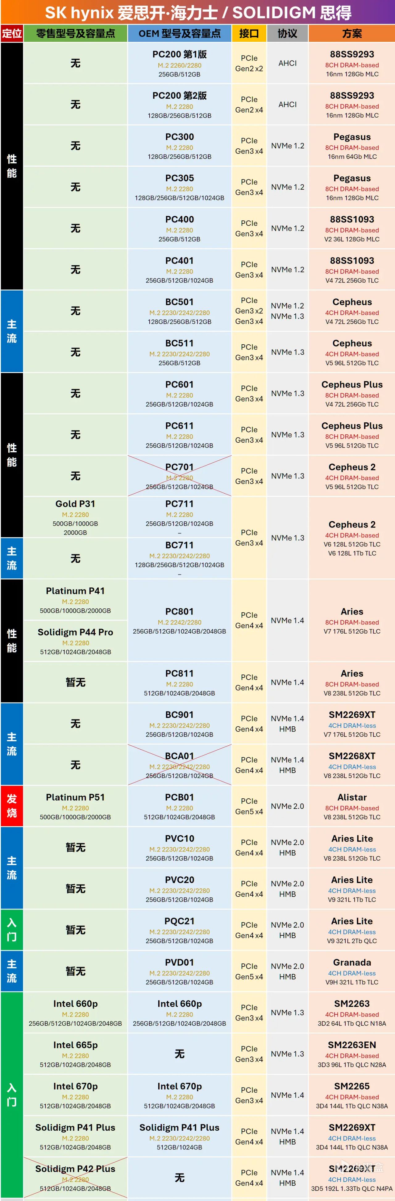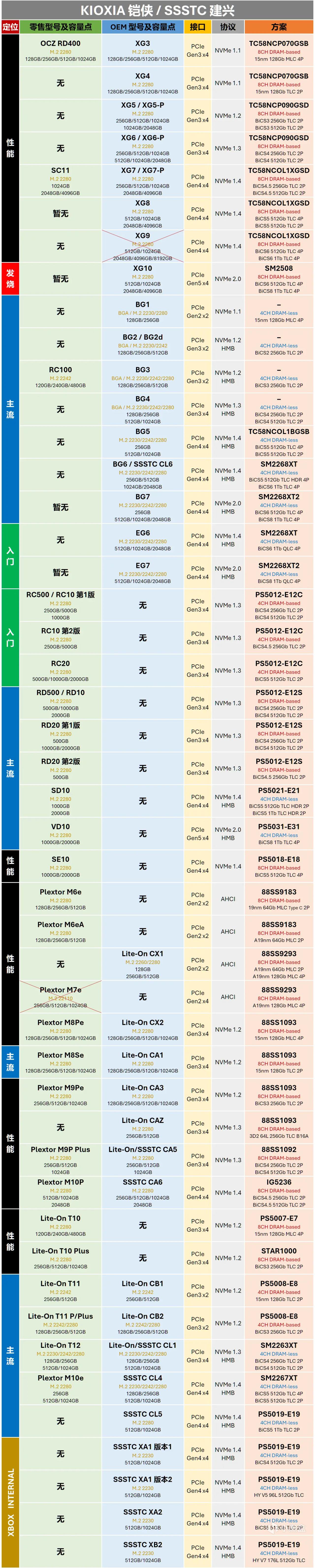 VictorTDD大佬这张表格最大的价值在于,不仅提供了零售版与OEM版固态硬盘之间的对应关系,而且还顺带把各大SSD厂商产品线采用的硬件方案与NVMe协议版本、接口速率等信息都一并汇总了。
