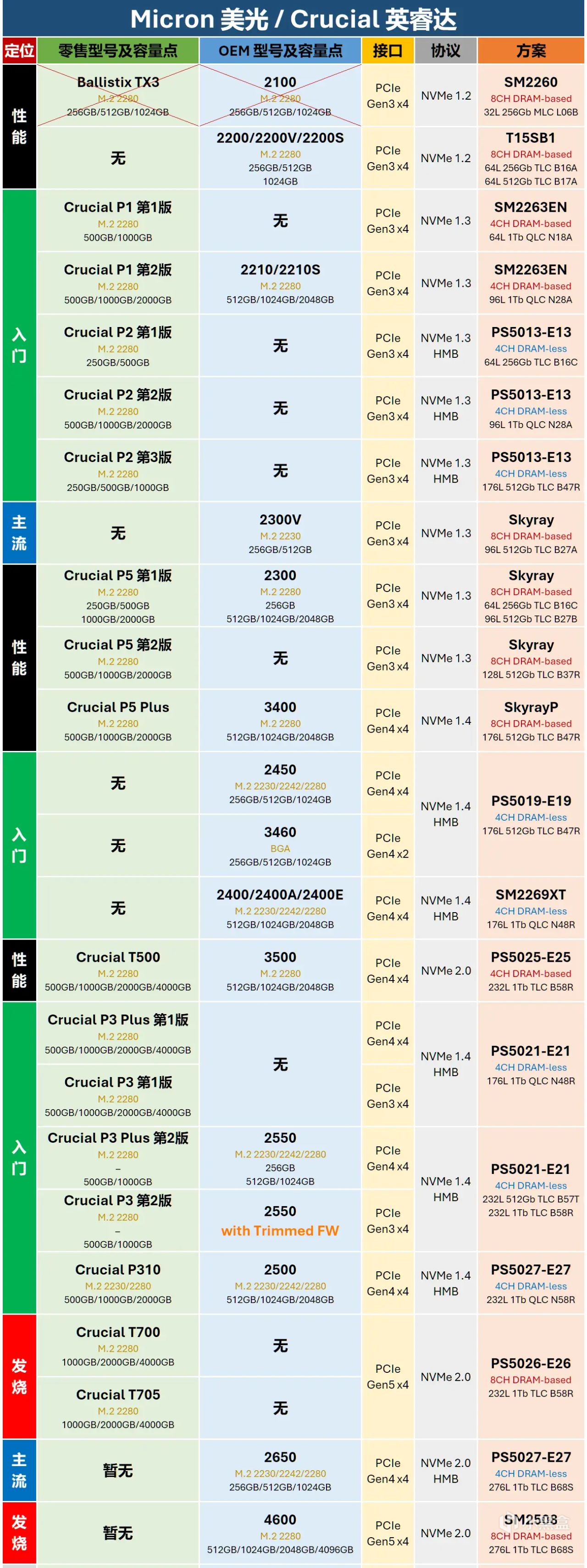美光(英睿达)这边的消费级M.2产品线型号比较少,其中值得注意的是,入门产品P3 Plus虽然在上市之初是一款纯粹的QLC SSD,但随着时间推移反而出现了反向升级,部分500GB和1TB容量的版本存在QLC和TLC颗粒混用的情况。