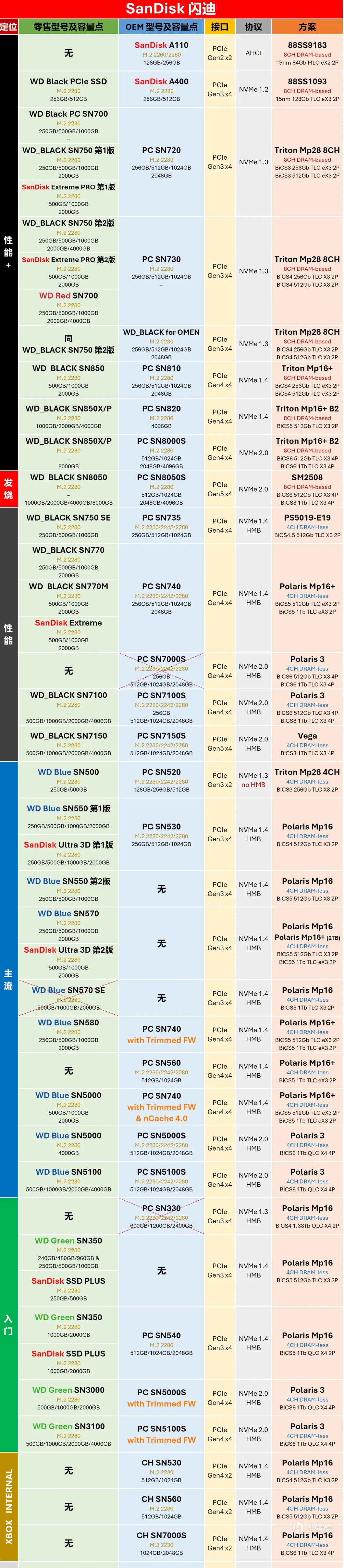 西数的SSD技术来源于收购的闪迪,所以这里VictorTDD大佬把闪迪西数合并在了一起。西数的消费级SSD型号不少,刀法也很精准,在各个价位都能找到能打的产品,整体上还是维持了一线存储大厂的牌面。