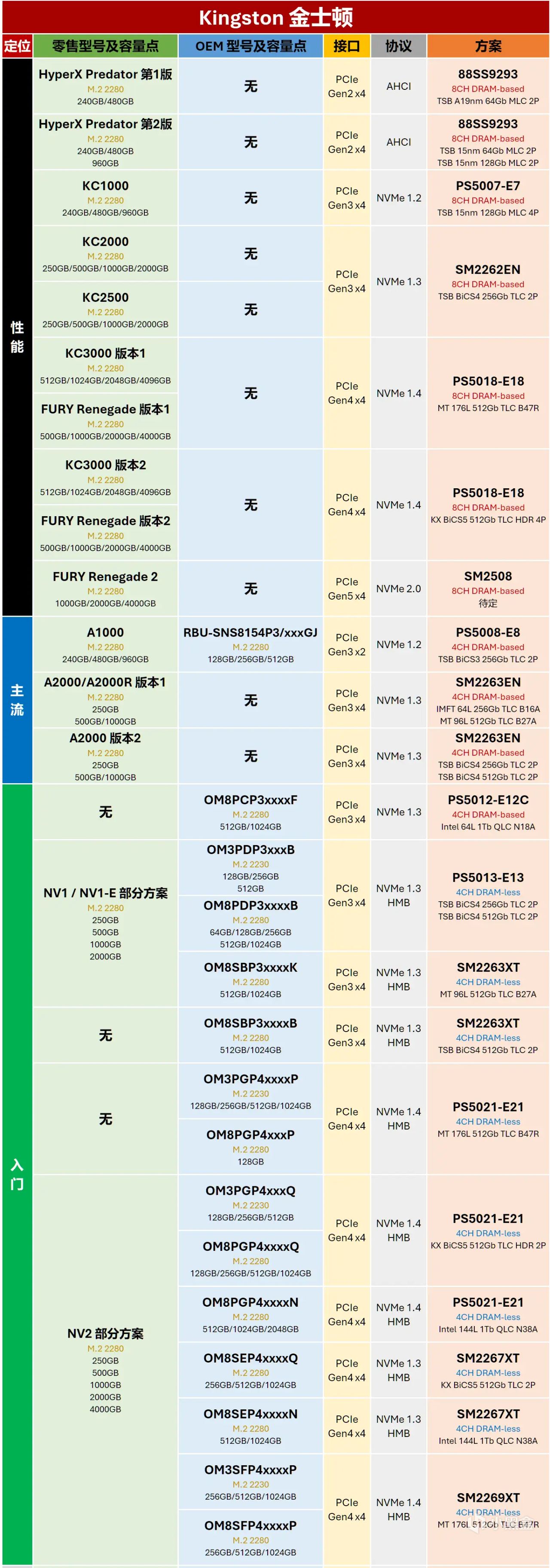 有一说一金士顿KC3000是块很好很好的Gen4旗舰有缓SSD,但零售端常见的入门型号,例如NV2、NV3这种,就着实有点难崩了,表格中只整理出部分NV2采用的硬件方案,可以说各种主控/颗粒的组合真的让人眼花缭乱,水有点儿深,普通消费者建议慎重考虑。