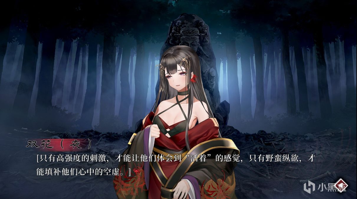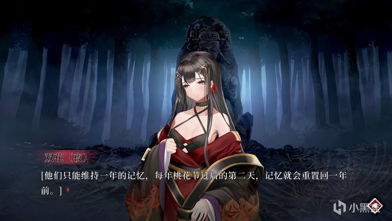 推進劇情不斷深入,會發現夜晚的桃花源纔是真正的呼鉞村。村民早在漫長的兩百年前,日暮一日的重複不變中喪失理智,變得麻木,最後失控。爲了讓村民們不是終日混沌,神女雙花爲桃花源制定了白天和夜晚兩套規則,並且會在每次的桃花節上開始新的輪迴。