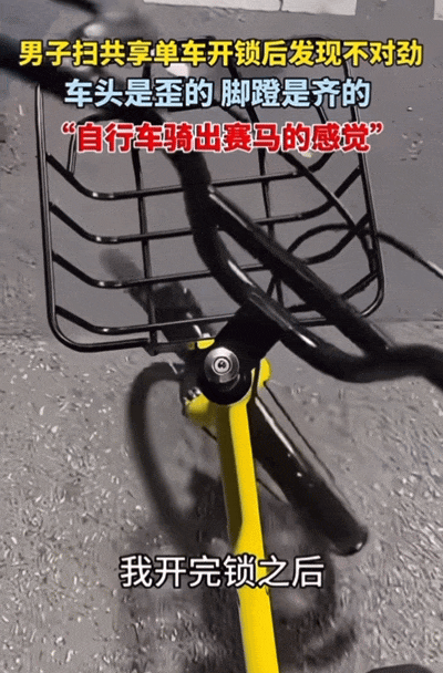 12月19日,河北,男子掃共享單車後發現不對勁,車頭是歪的,腳蹬是順拐的,但他還是堅持騎了出去。