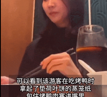 視頻顯示,該遊客在喫烤鴨時,拿起了墊荷葉餅的蒸籠紙包住烤鴨肉塞進嘴裏,喫了“紙卷烤鴨後”,該遊客露出疑惑的表情,並在發佈的視頻中配文:“雖然中國人什麼都喫,但這也太…”