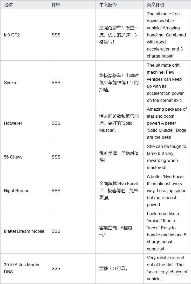 2,不同车辆的最高速度、加速度、重量、重心、氮气 加速都有所不同,手感也不同。
