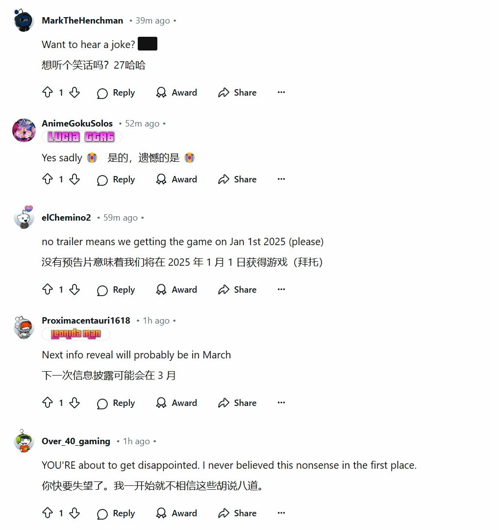 預告片的落空迅速在玩家社區中引發了強烈的失望情緒,尤其是在 Reddit 等論壇上,許多玩家紛紛發帖表達自己的不滿和失望,甚至帶有一些嘲諷的意味。