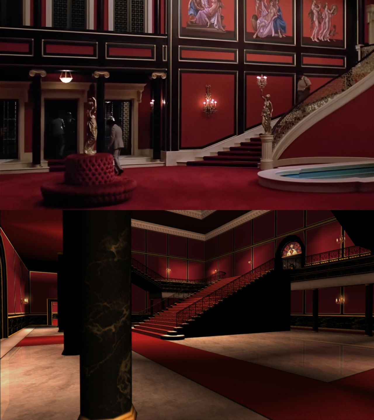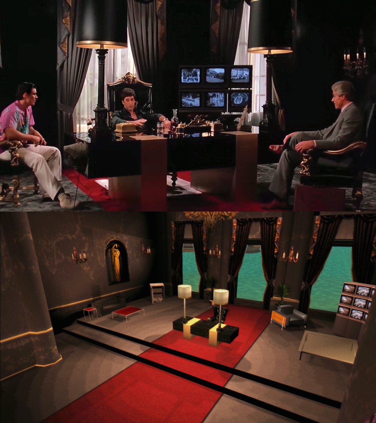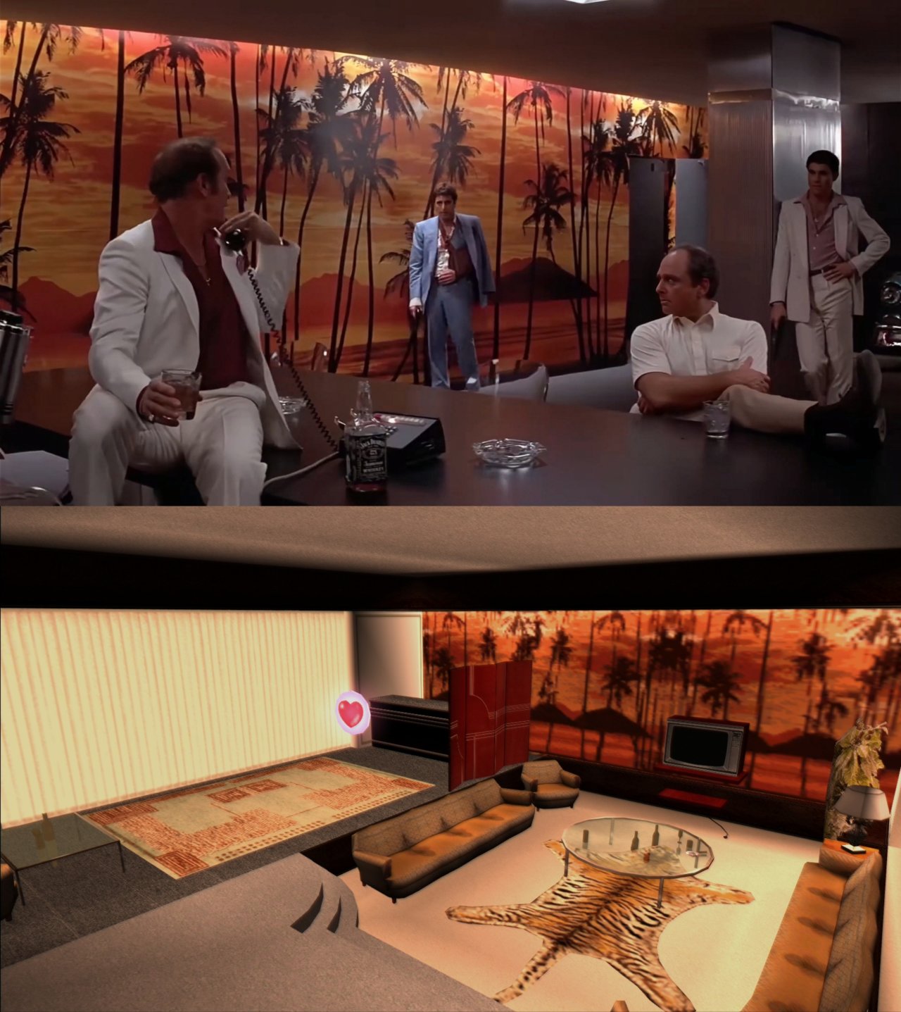 布景里边缘带有纹饰的窗帘、形似拱门的办公桌和位于上面的两盏台灯、红色地毯和奢华王座,以及多屏组合闭路电视显示屏,整体样貌几乎都还原进了位于海星岛的维赛迪庄园(Vercetti Estate)二楼办公室内。