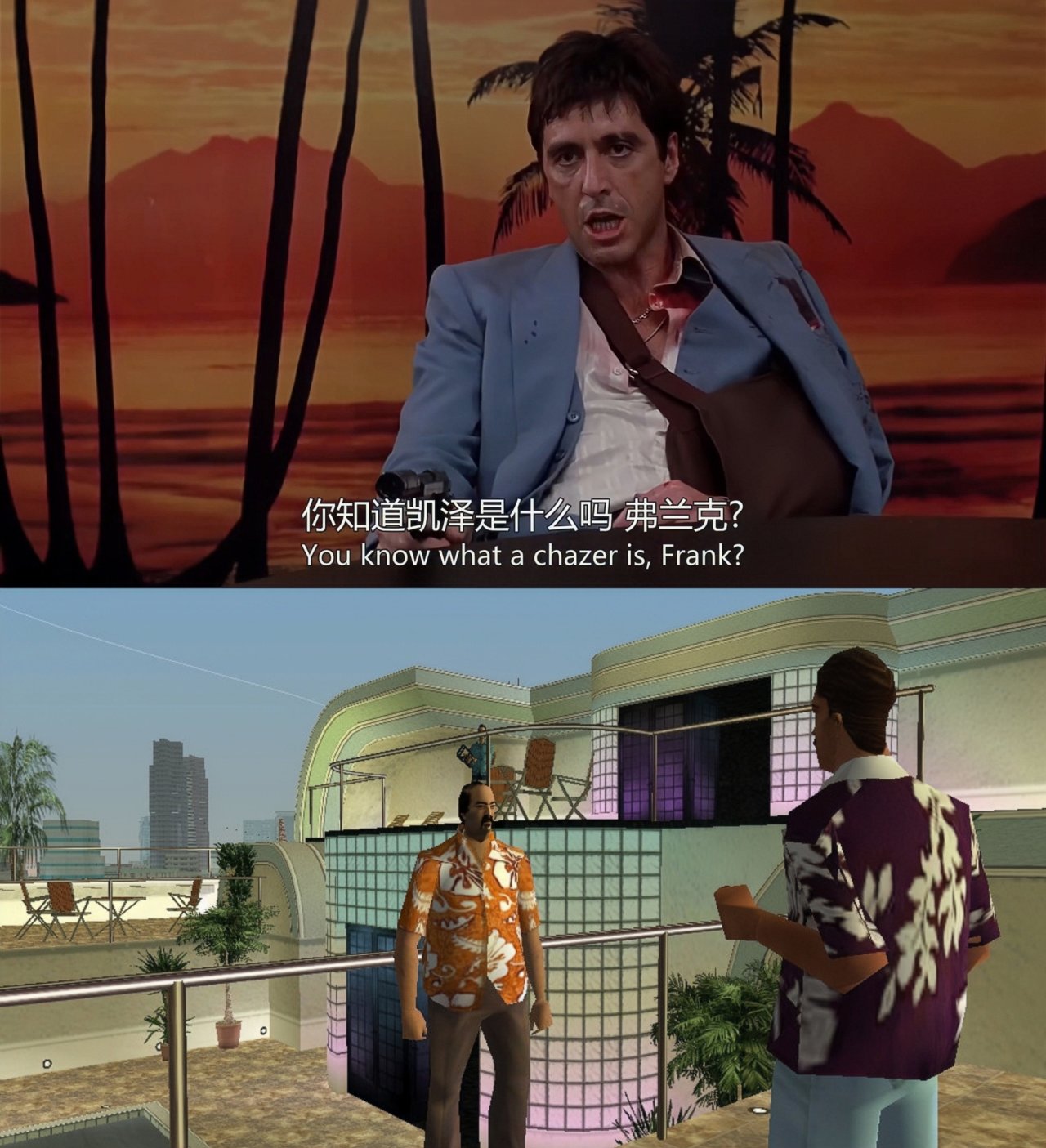背信弃义的猪猡 (Treacherous Swine)任务中科尔特斯上校交给汤米一把链锯,并委派其除掉背叛自己的冈萨雷斯。如果不出意外的话,就是根据电影桥段中提到的犹太语“Chazer”一词而来。