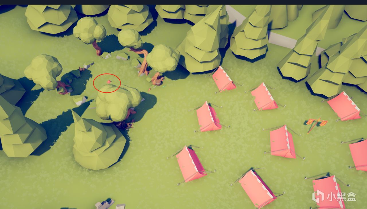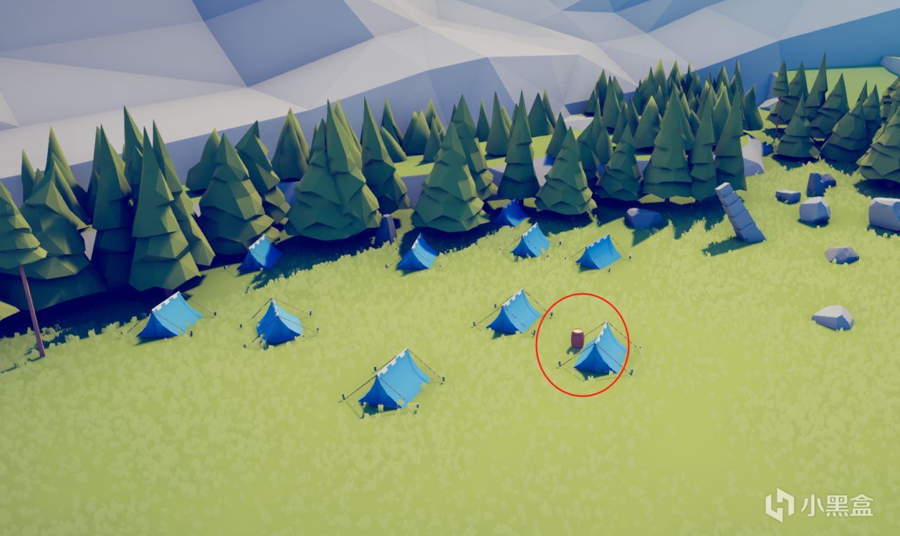 红色帐篷区域上方有一个石头围住的小圈