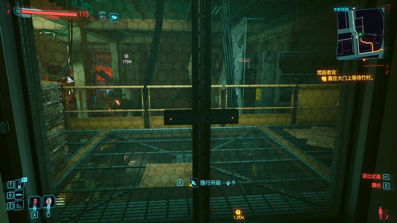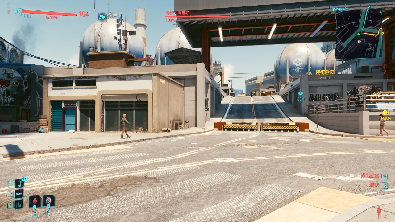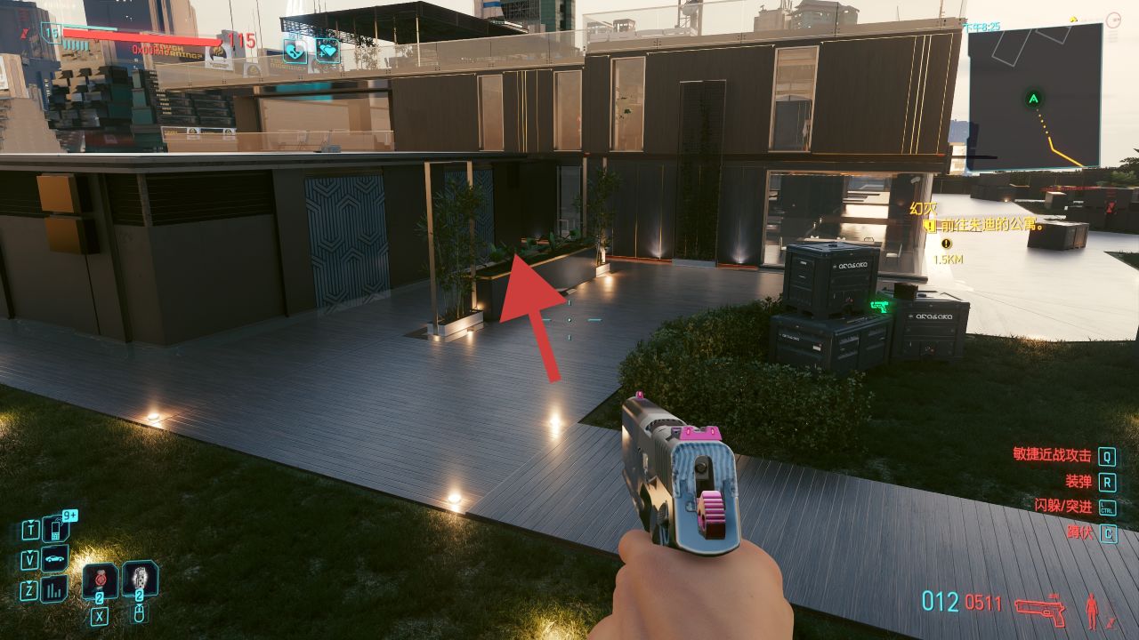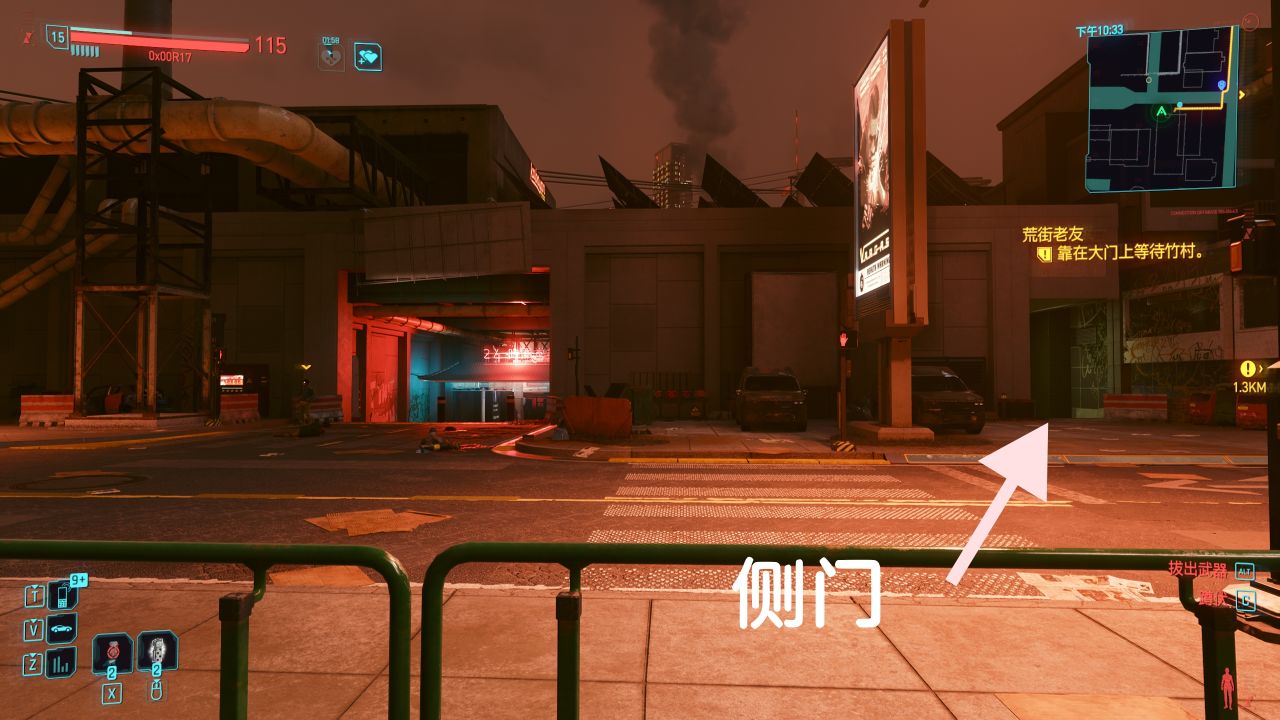 可以在这栋大门这里看到有两个人,里面还有一群【荒坂守卫】,不要慌,我们有办法不触发战斗也能白嫖这把武器。