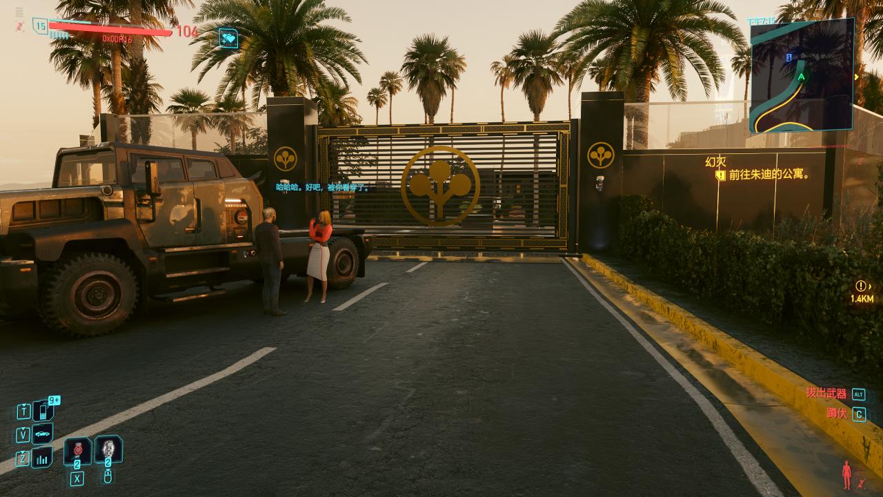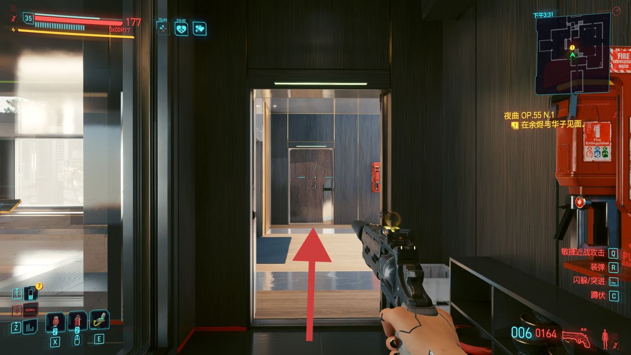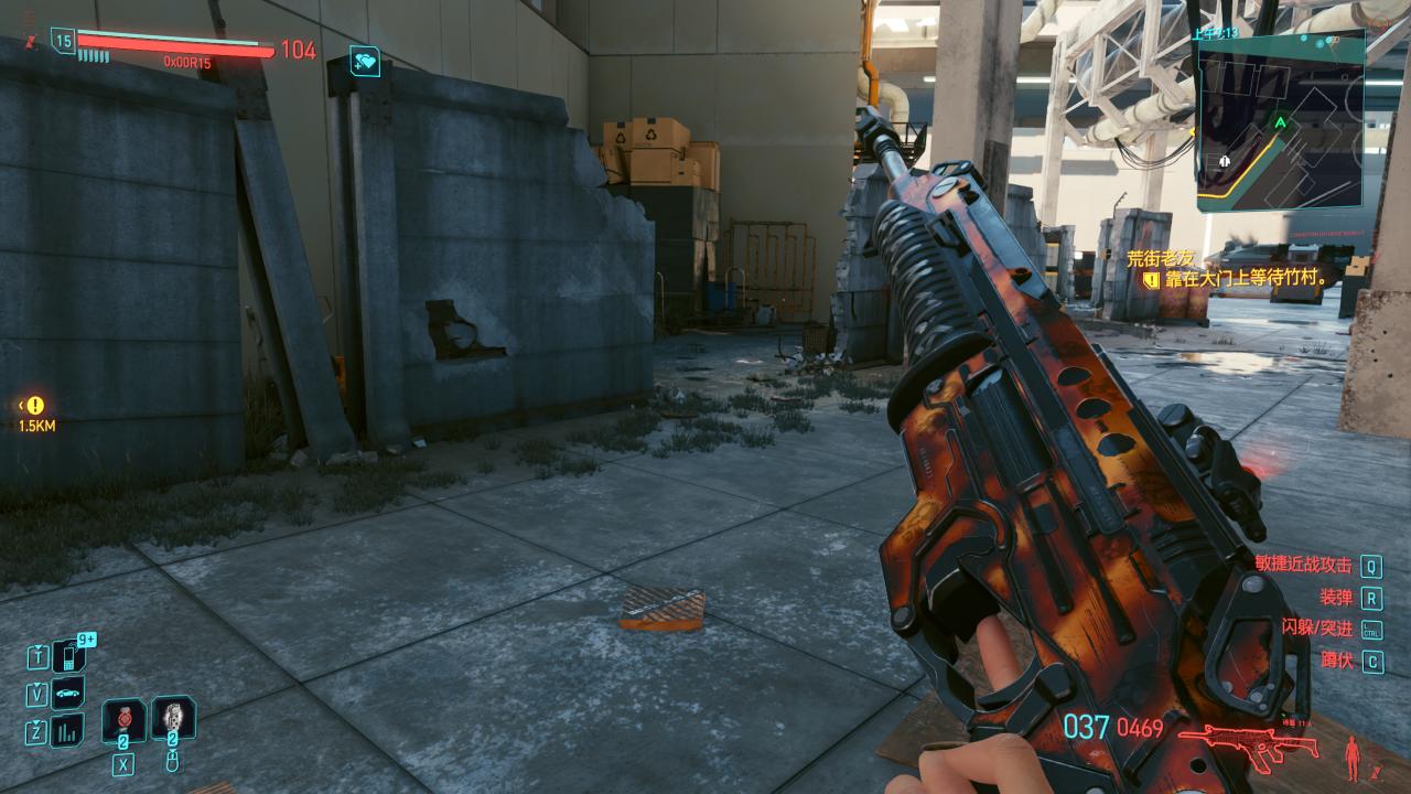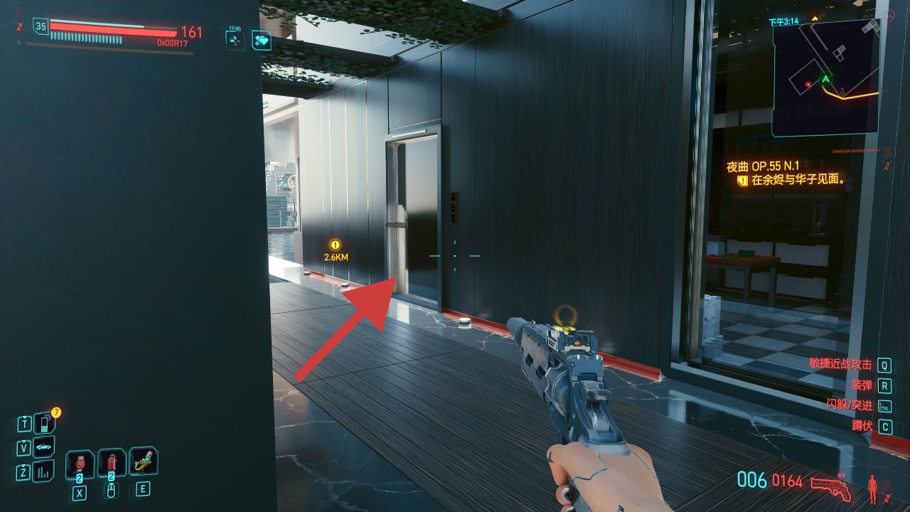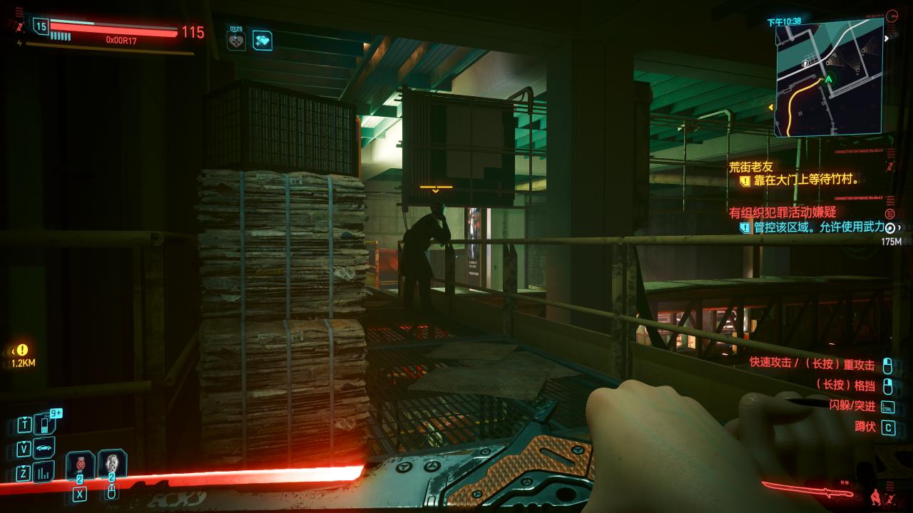 可以在这栋大门这里看到有两个人,里面还有一群【荒坂守卫】,不要慌,我们有办法不触发战斗也能白嫖这把武器。