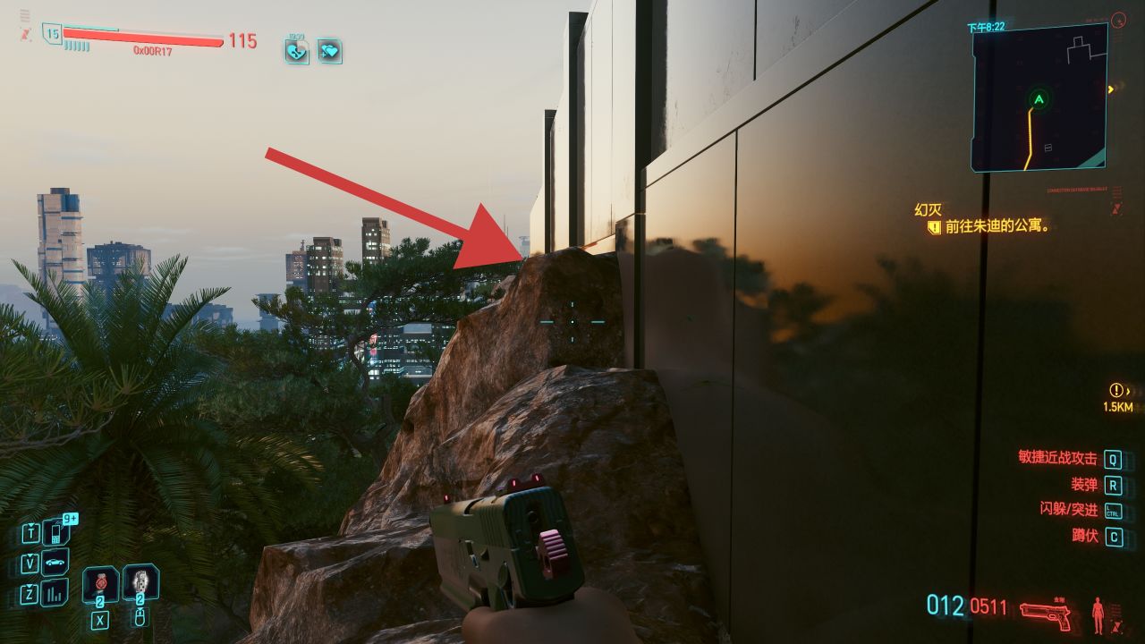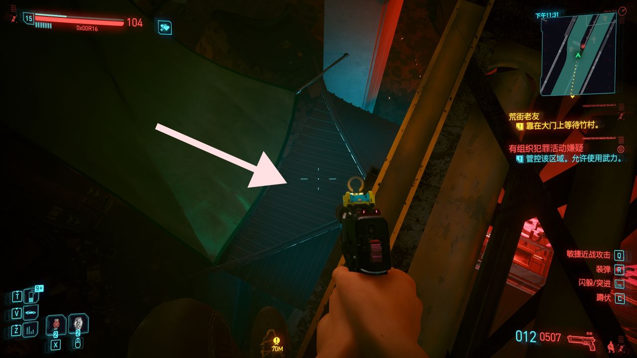 这把武器要拿的话有一个小前提就是必须拥有【二段跳】义体。满足要求跟着我的路线走也是白拿的。我们从【荒坂地产】的传送点往下走来到我标点的这里。