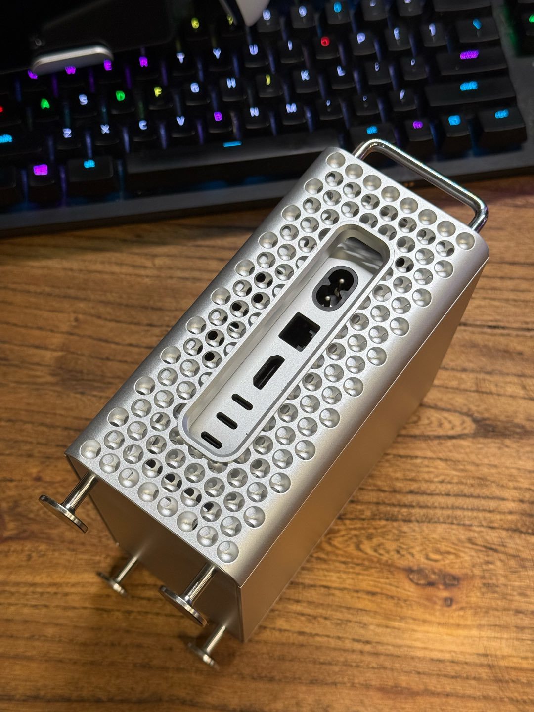 OK,以上就是這款機箱的鑑賞內容。這套方案還有很多可以拓展的玩法,比如內部還能塞m.2固態硬盤,以及前面板的接口(1個3.5mm和2個typec)也可以引到後面來,4個腳也能替換成mac pro那樣的輪子。