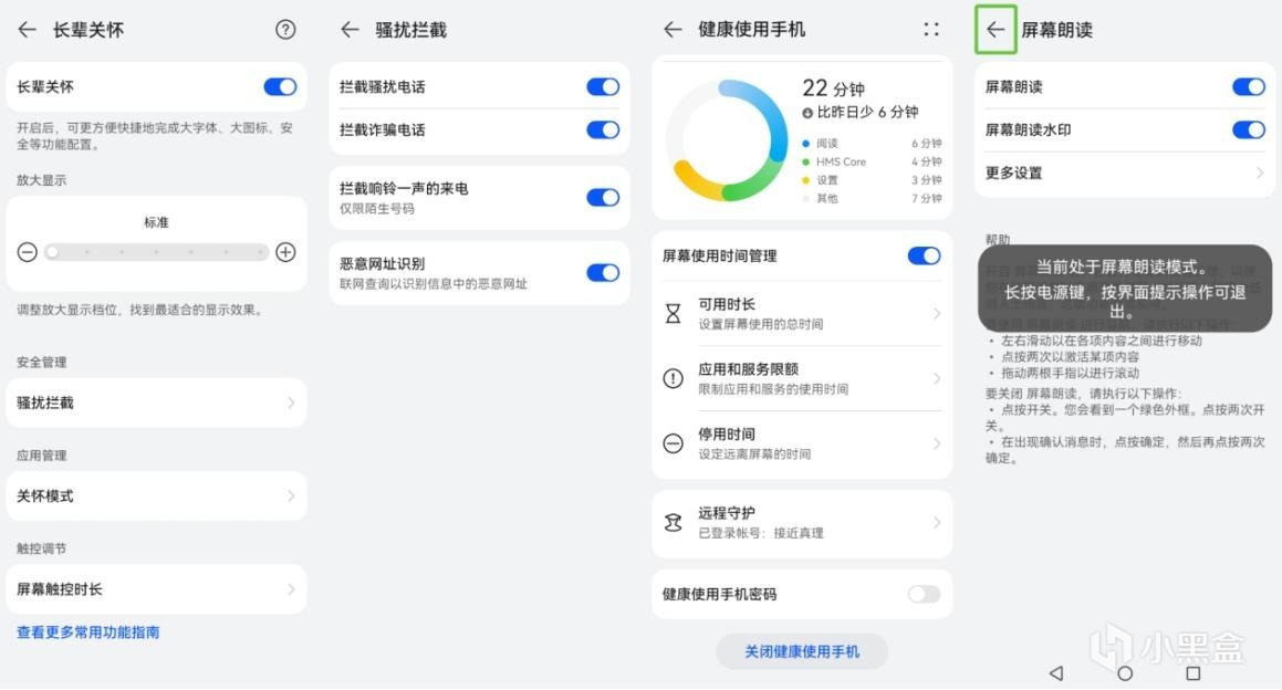首先就是字體大小,這是最直接影響的地方,長輩關懷模式下我們可以調整字體到最大,一鍵放大字體、開啓騷擾攔截之後簡化手機操作,屏幕朗讀功能則更好地幫助他們獲取信息,遠程守護則是子女實時查看位置信息的關鍵,以備不時之需。