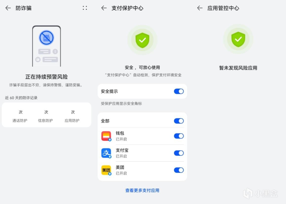除此之外,Hi暢享70 Plus還提供了支付保護中心和應用管控中心等功能,因爲我們使用手機支付成爲日常,不法分子就是利用這一特點,竊取用戶信息等等,而支付保護中心可以時刻保護用戶的支付安全,有效監控支付環境,對於一些用戶的敏感信息都會進行加密處理。