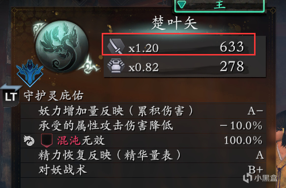 • 楚葉矢的優勢是無硬直,在場時間長,可以朝人物鎖定的敵人涉及,效率非常高,並且魂核攻擊力面板修正1.2倍全遊戲第一,優點很多,無硬直爲什麼作爲優點是因爲妖怪的回妖機制是每次處於自由態纔會判斷是否處於混沌以及是否空上限決定是否能回覆妖力開常暗,受擊是直接進入自由態的,因此楚葉矢和從符這類無硬直手段可以做到在上限未空混沌結束還能再上第二次混沌繼續控住妖怪(需要在混沌快結束前停止攻擊,放怪進入攻擊動作再釋放從符和楚葉矢)。