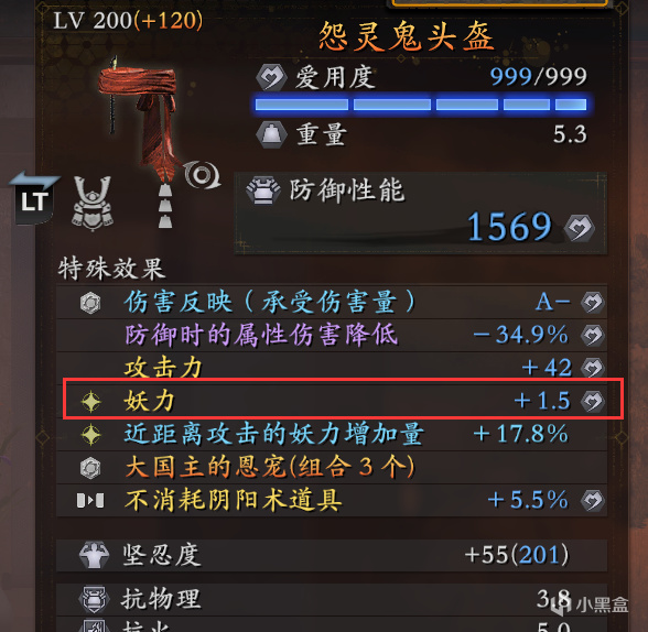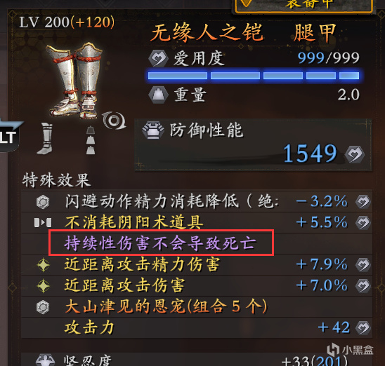 PS:此詞條的數值爲概率,意思是滿血情況有概率降低一半受到傷害,豬立前頭盔33%和本多武家滿級80%才能必定減傷,大山5則是直接100%概率減傷