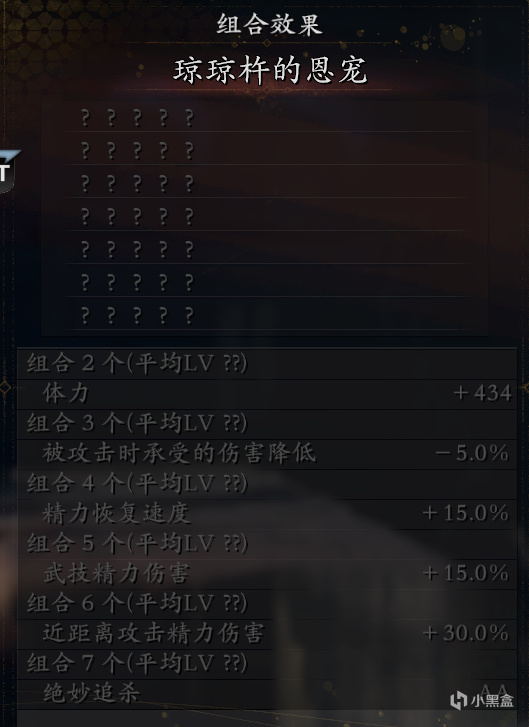 • 第三是絕妙追殺,這個詞條會在某些套裝和繪捲上出現,其機制是將玩家身上的近距離精力傷害詞條在處決和追擊時按比例轉化爲近距離增傷詞條,武技精力傷害詞條按比例轉化爲武技增傷詞條。個人的評判是這一詞條只有在瓊瓊杵7上纔有價值,第一是因爲瓊7的絕妙追殺評級最高效果最好,第二是瓊瓊杵提供了大量精力傷害詞條,以此順水推舟,引入這個套裝時戰鬥思路應是主打快速清空精力多次處決,武器有快速削精技的可以考慮這個套裝和這個詞條,比如手甲(崩矢倉)。