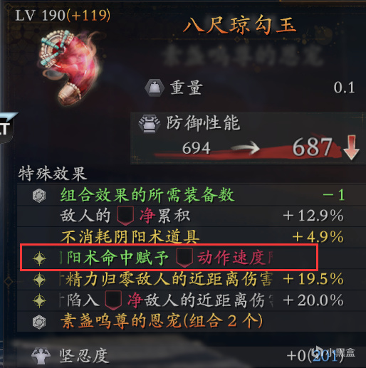 當然也可以在手臂上出一個陰陽術/忍術命中賦予移動加速,使用陰陽術多的配裝可以全程觸發不需要管太多(近戰基本用不了),後者對於普通近戰配裝手感較差,因爲時不時需要丟飛鏢續一下,不如吸收精華賦予。