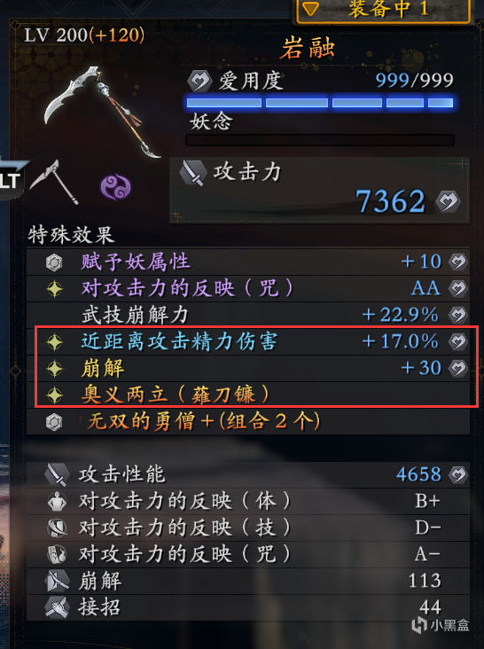 武器選擇這裏就有了一些不同。主流的妖鐮刀一般都是用立烏帽子鐮刀,因爲這個鐮刀自帶賦予妖屬性,二詞條和火車一樣是吸收精華賦予移動加速,是一個非常優秀的杖,或者用固定詞條爲精力消耗降低的外法鐮刀,需要刷出賦予妖屬性詞條。但配裝基礎框架內,移動加速buff天鈿女3件套就能提供(閃a命中賦予);雖然鐮刀的精力消耗是重武器級別,但可以利用遊戲收刀瞬間立刻恢復精力以及收刀鍵組合了殘心鍵的設計,通過結界符讓瞬發瑞雲變成一個回精動作——瑞雲是鐮刀的收刀武技,精力不足時以收刀達成殘心配合結界符+180%精力恢復速度可以瞬間偷出一大罐精力,並且因爲可以瞬間釋放能繼續壓制對方防止逃跑。根據前面的分析,主流的兩種妖武器底子的優勢就沒有那麼大了,就能選擇其他的底子。巖融的優勢是作爲固定套裝部件武器,允許出現3個真星號詞條,可以做到同時出崩解精傷和奧義兩立3條星號詞條,並且固有詞條只有一個賦予妖屬性沒有浪費,並且剩餘一個詞條位自由支配。因此選擇巖融作爲武器。