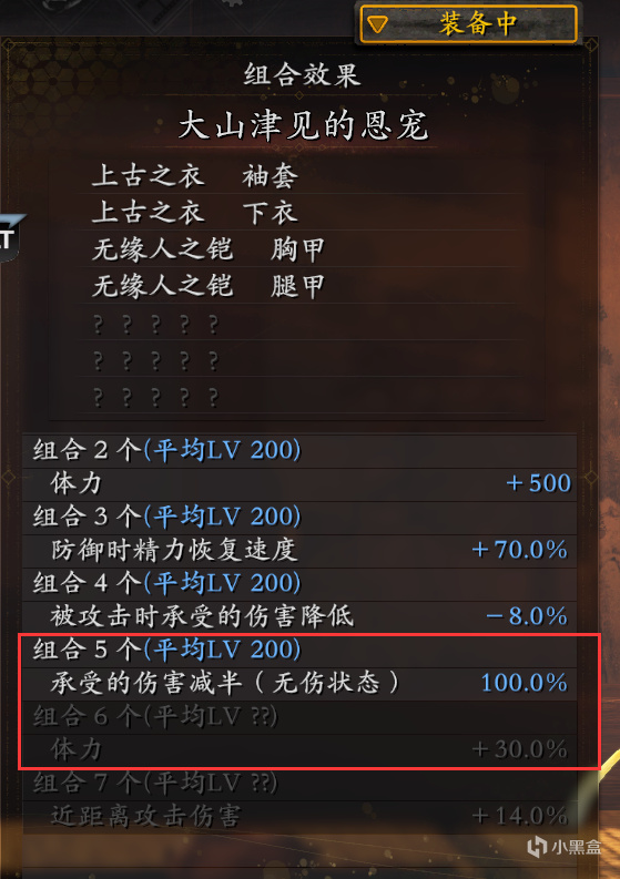 滿血時受到傷害減半——血量滿(等於上限,喫死裏求生丸後並不能算滿血)50%——豬立前頭盔+本多武家/大山津見5