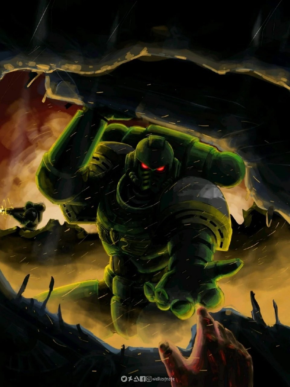 中间的故事有点复杂,简单来说就是火蜥蜴一连连长努米翁通过自我牺牲在夜曲星最大的火山地下复活了伏尔甘,同时伏尔甘在火山里发现了两件自己毫无印象的造物:七锤护符和战锤燃烧之手,以及整个星球上最后一个网道大门。