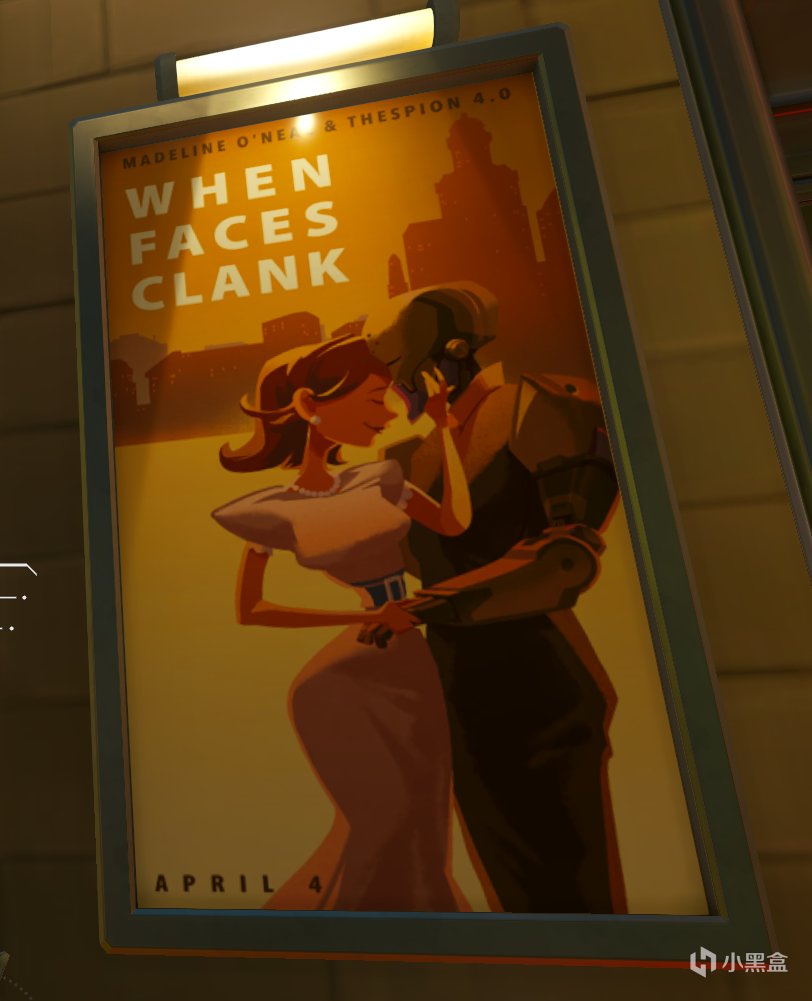 來自中城地圖的一張電影海報“When faces clank”(意即臉頰叮咚響)。海報位於中城進攻方A段出生點出門正對位置,電影講述的是一段人類與智械的戀情。