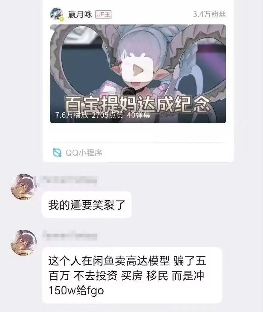 而我们本期的主角就显得格外的抽象,他靠卖高达骗了500个W以后,转身拿去充了FGO,还让人直播代抽......