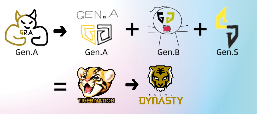 你可能以为这是谁的P的表情包,实际上它们确实是这样的logo,上面3个战队都是当时的青训队,最后三队合并成了TigerNation,然后就演变成了后来的首尔王朝队。